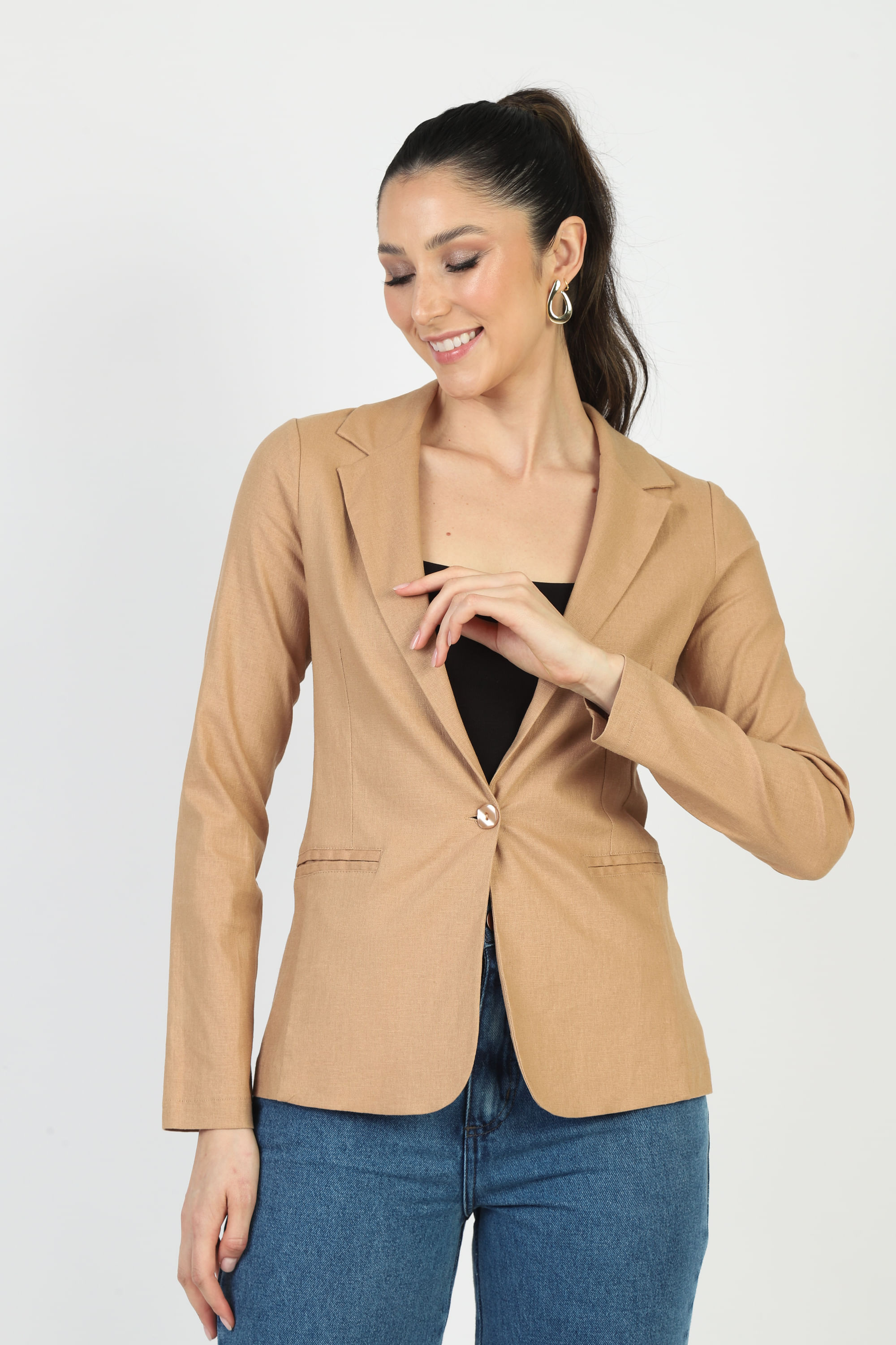 Blazer acinturado confeccionado em um tecido com linho e sua composição. Gola com lapela, manga comprida e comprimento médio. Fecho frontal com botão forrado no mesmo tecido.