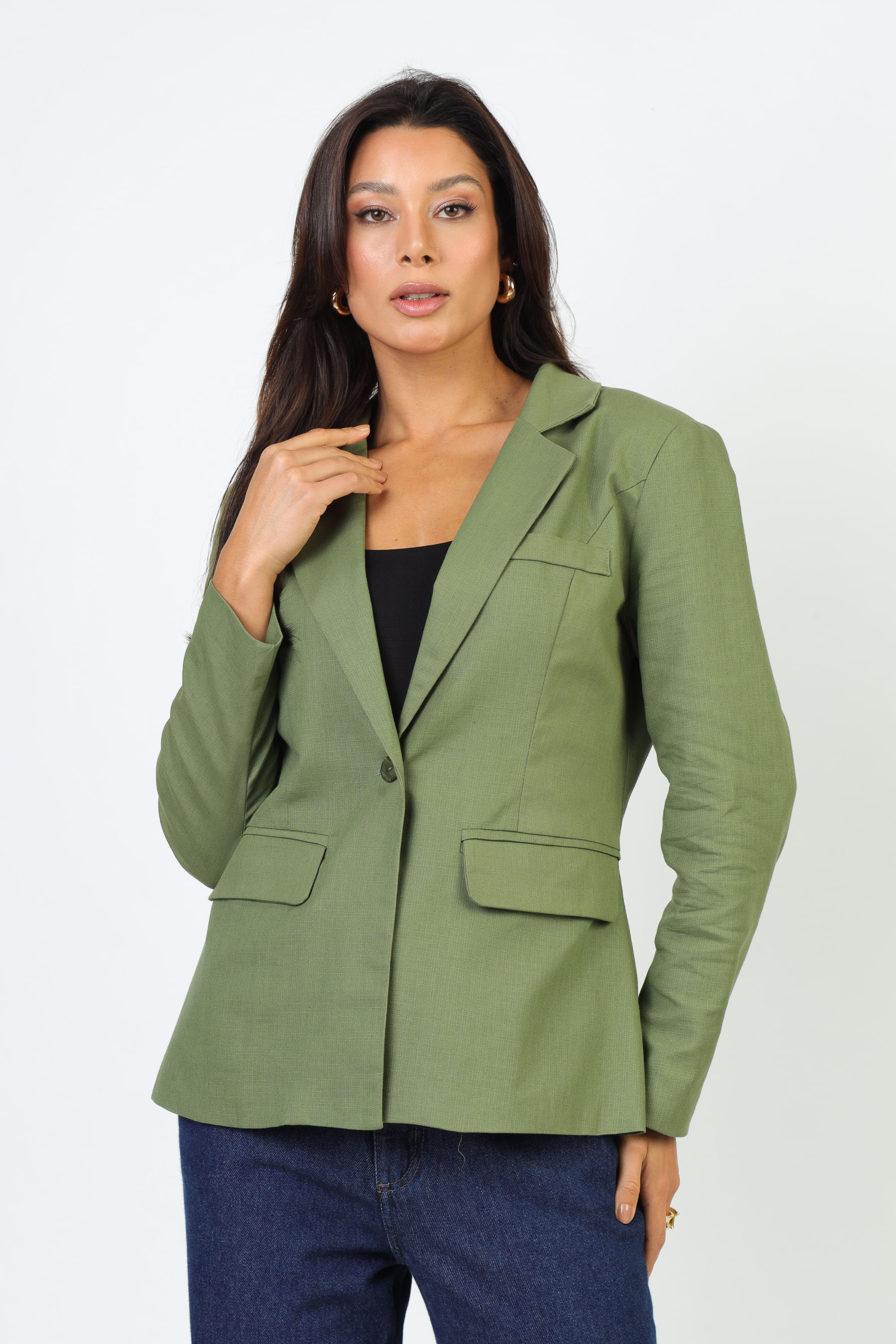 Blazer alfaiataria, gola com lapela, manga comprida, bolsos com aba, comprimento médio e abotoamento frontal por botão. Confeccionado em uma mistura de algodão, viscose e elastano