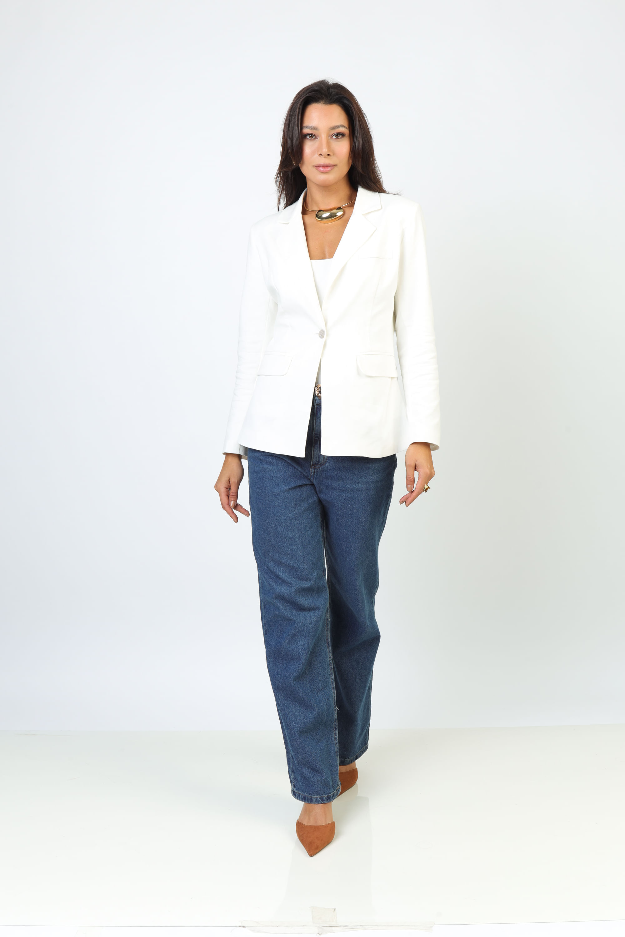 Blazer alfaiataria, gola com lapela, manga comprida, bolsos com aba, comprimento médio e abotoamento frontal por botão. Confeccionado em uma mistura de algodão, viscose e elastano