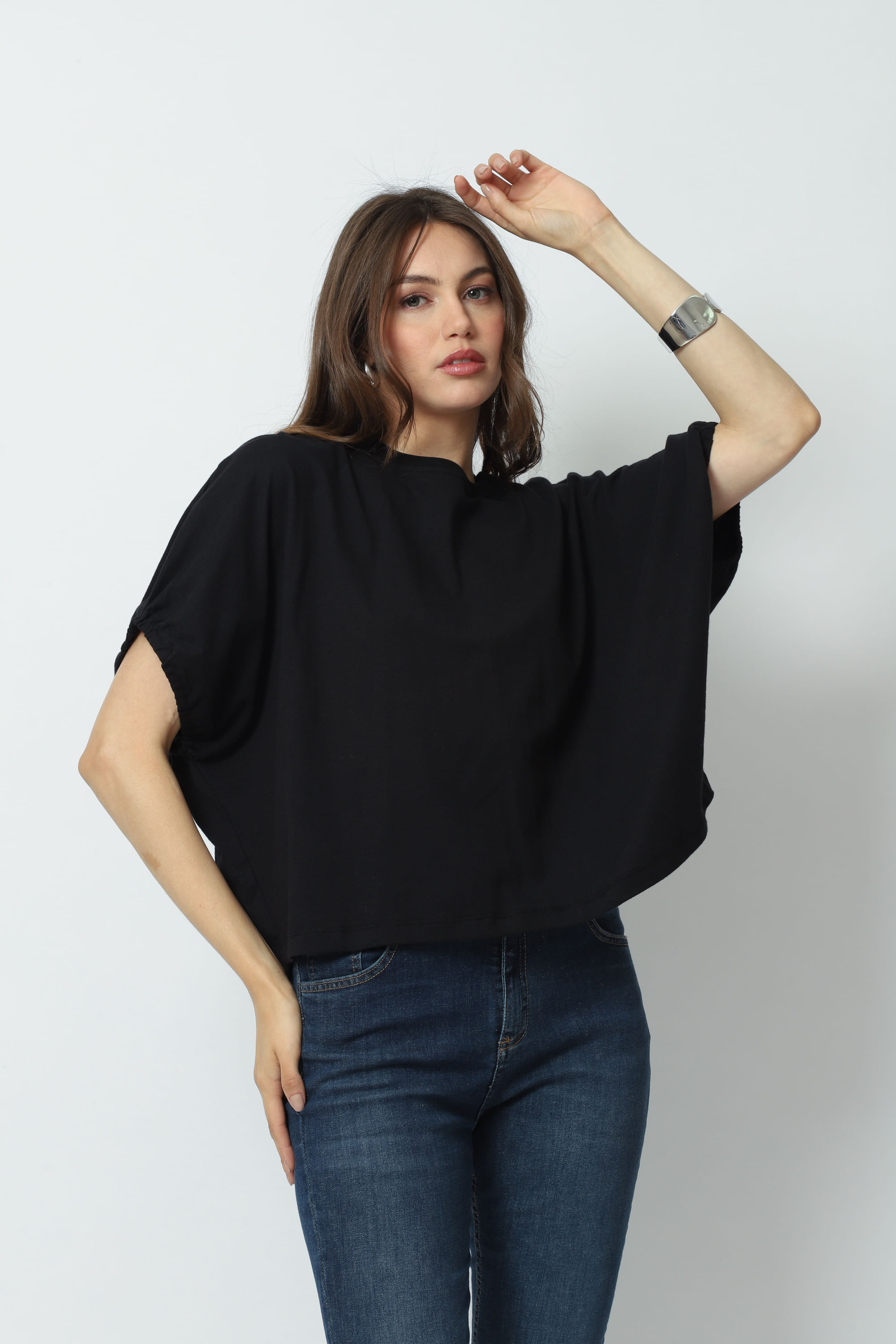 Blusa modelagem oversized, manga curta com detalhe de elástico na barra e gola redonda. Confeccionada em 100% Algodão, possui um toque suave e fresquinho.