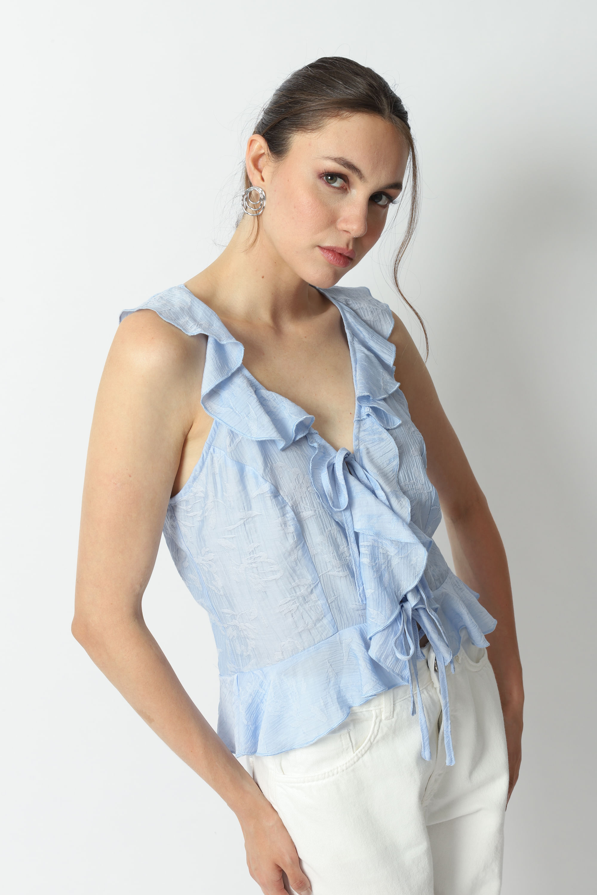 Blusa trabalhada com babados e amarrações frontais que adicionam um toque romântico, Confeccionada em tecido leve com toque suave, ela traz um caimento fluido que valoriza o visual.