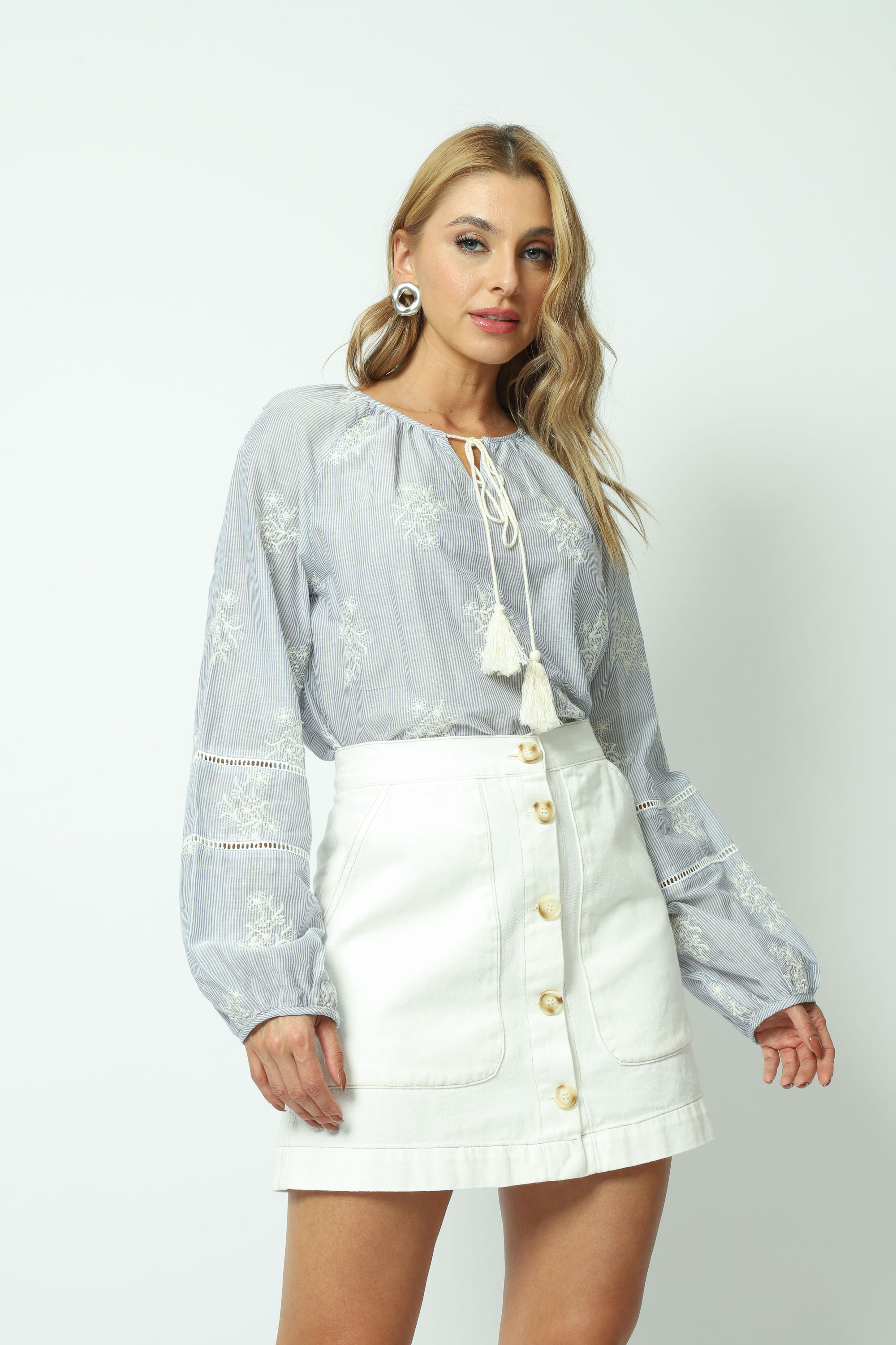 Bata listrada, modelagem com silhueta ampla, manga longa com com detalhe de guipir, decote V com amarração. Trabalhado com um bordado delicado que adiciona um toque de sofisticação e charme ao visual.