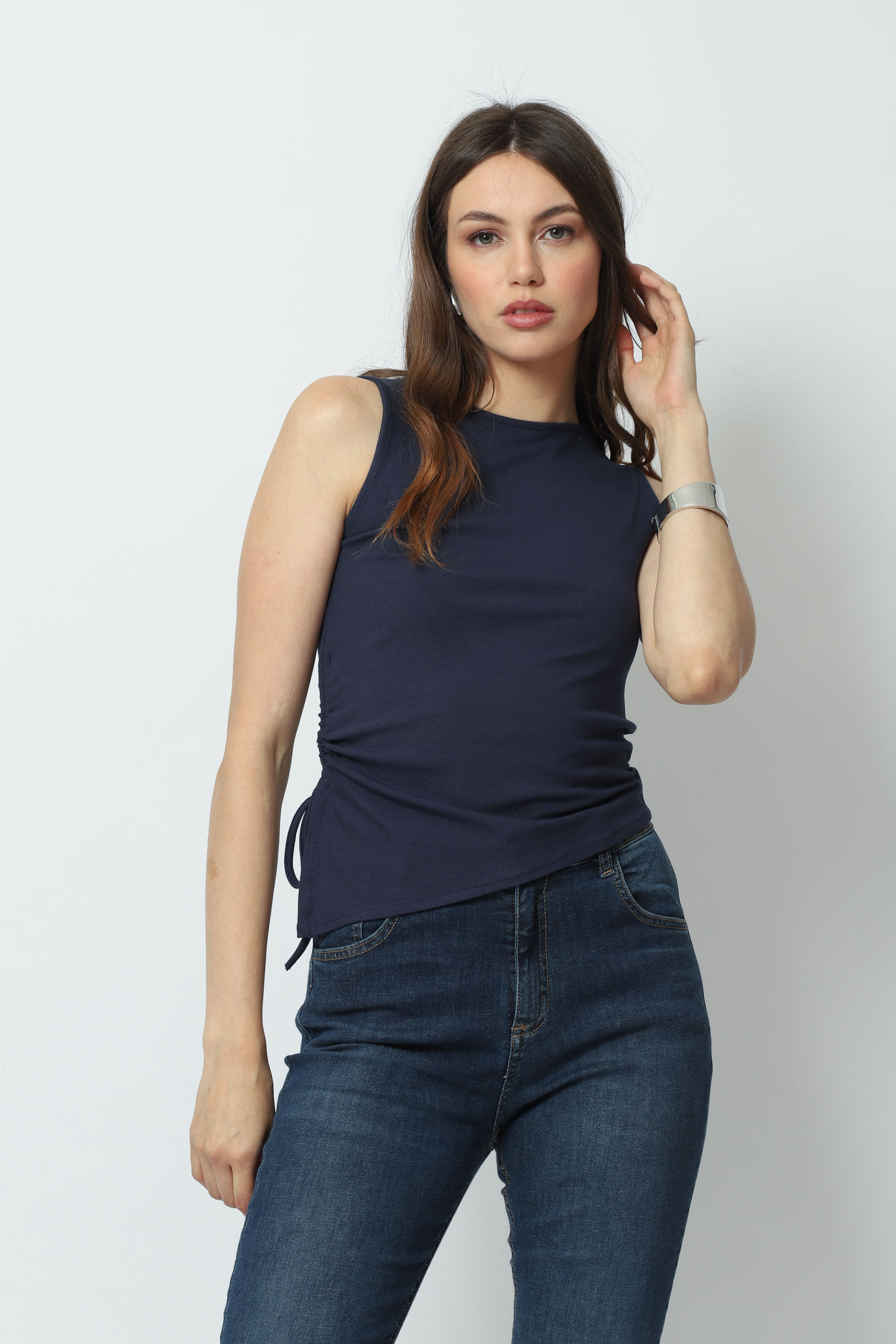 Blusa canelada com modelagem assimétrica que valoriza a silhueta e garante um caimento sofisticado. Com fenda e detalhe de franzido na lateral com cordão para fazer laço. Gola redonda, alças largas. Confeccionada em malha canelada com uma mistura de viscose e elastano, toque macio e sedoso e efeito anti pilling que não forma bolinha.