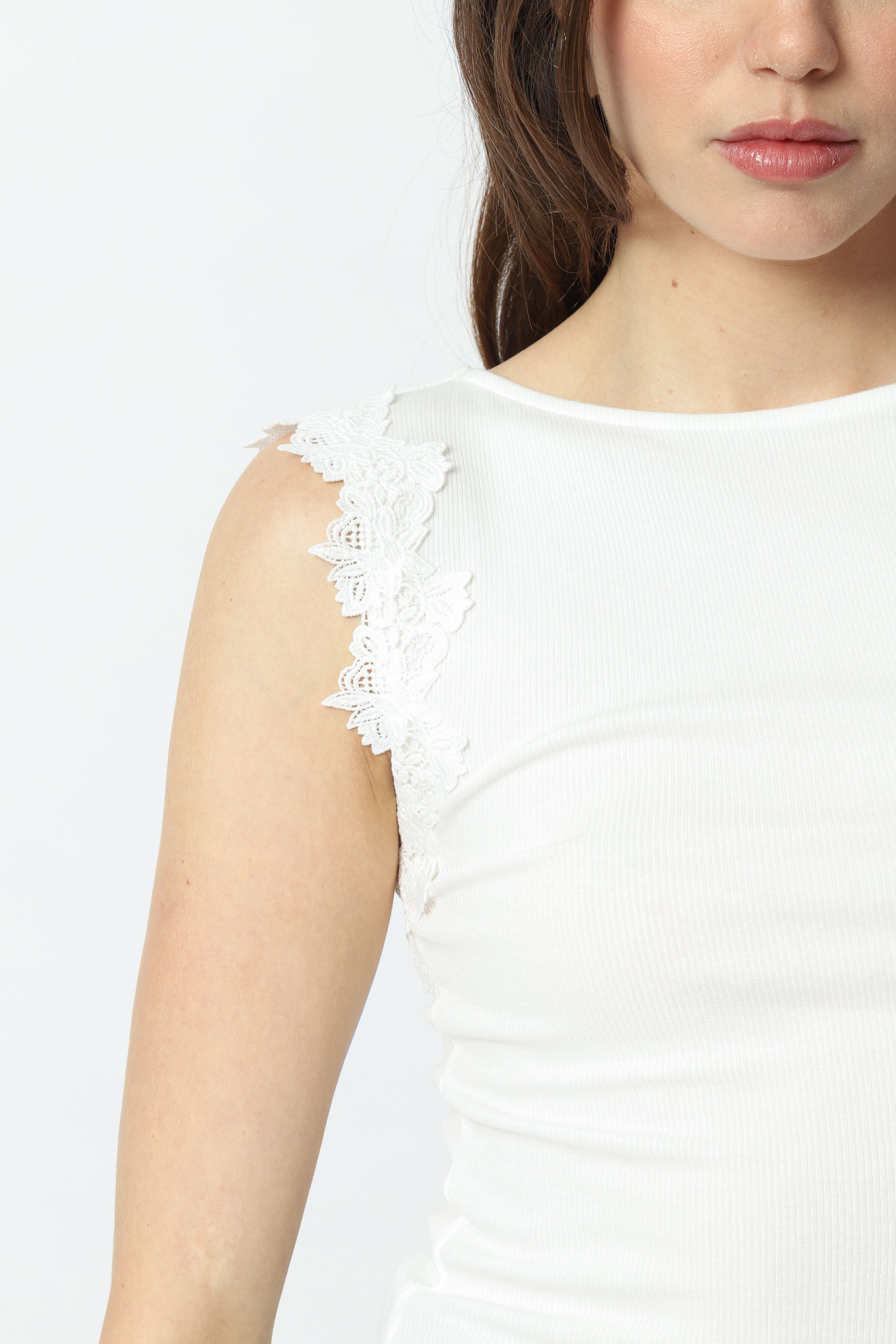 Descrição Blusa canelada, comprimento regular, gola canoa, detalhe de guipir nas cavas. Blusa confeccionada em uma malha canelada mistura de viscose e elastano, que garante conforto e ótimo caimento, com toque suave e macio.