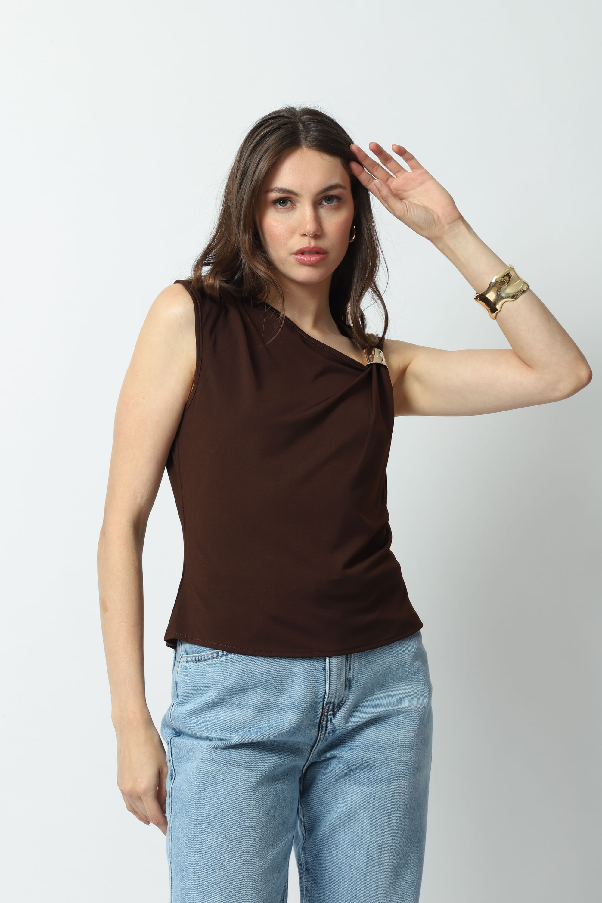 Descrição Blusa com gola assimétrica, detalhe drapeado em um ombro e no outro ombro uma fivela metálica dourada, que traz modernidade e sofisticação à peça. Confeccionada em um tecido leve com toque suave.
