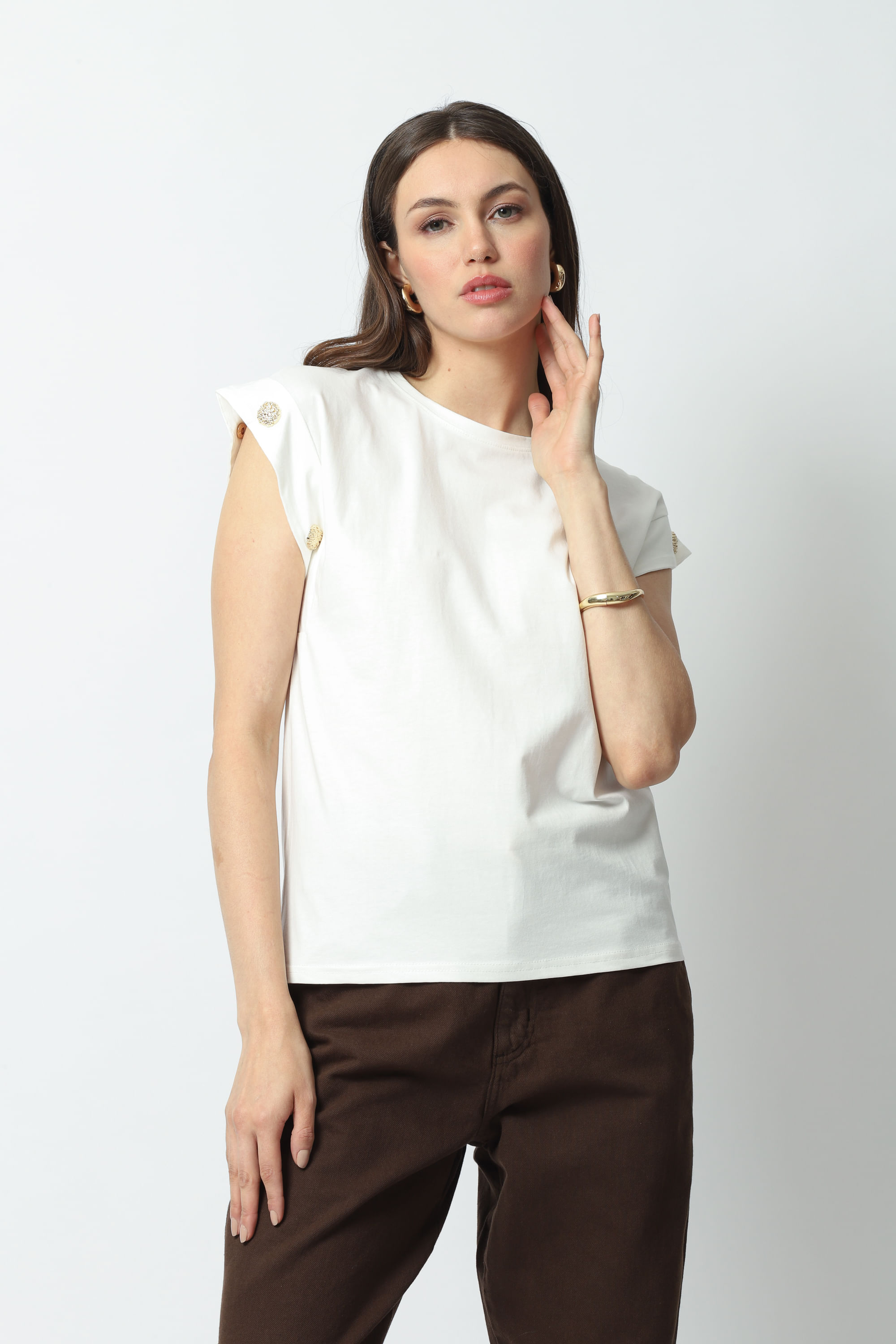 Descrição T-shirt com detalhe de botão dourado na cava frente e costas, gola redonda, manga estilo muscle tee e comprimento regular. Modelagem reta com caimento mais soltinho no corpo. Confeccionado em uma mistura de algodão e elastano.