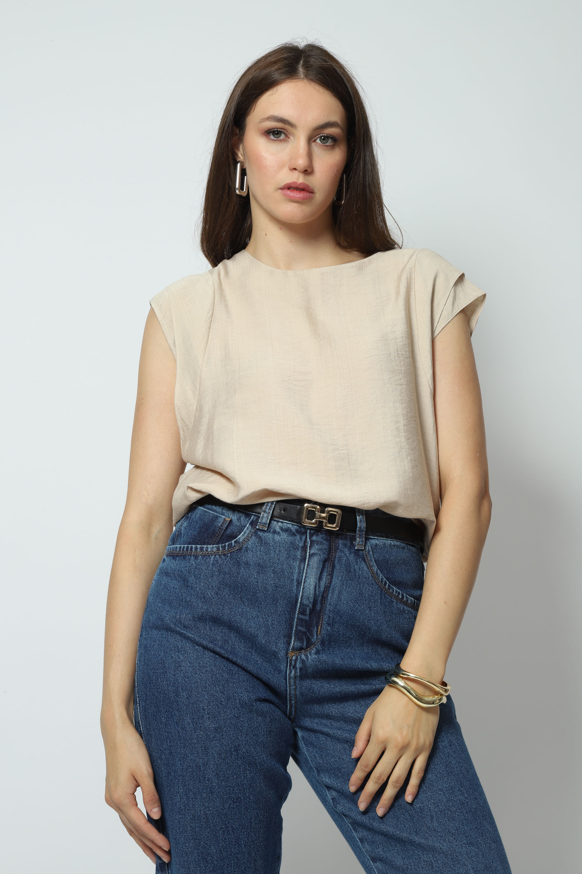 Blusa mangas estilo muscle tee com detalhe, comprimento regular, modelagem reta e soltinha. Fechamento costas por botão. Confeccionado em um tecido leve com mistura de viscose e poliamida.