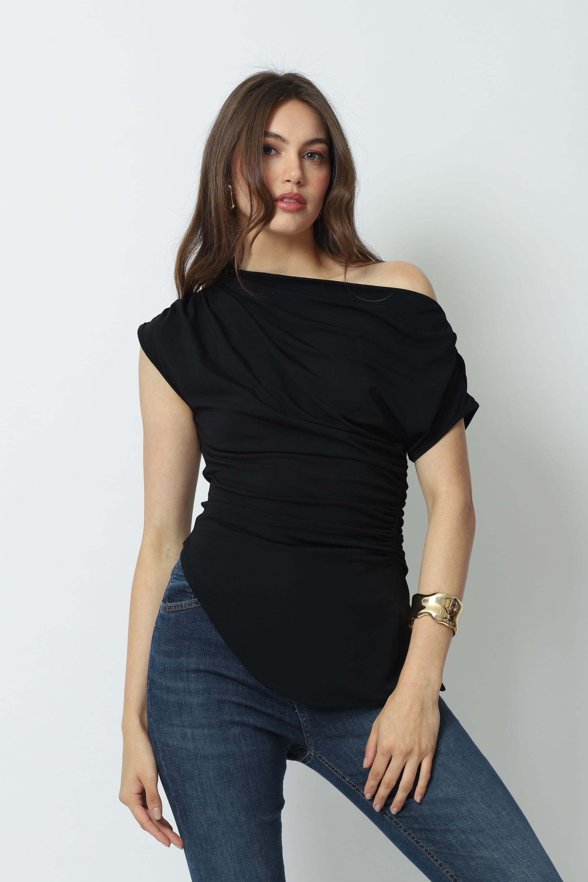 Blusa possui modelagem assimétrica que valoriza a silhueta e garante um caimento sofisticado. Com detalhe franzido na lateral e drapeado nos ombros traz modernidade ao visual. Confeccionada em malha leve e de toque suave.