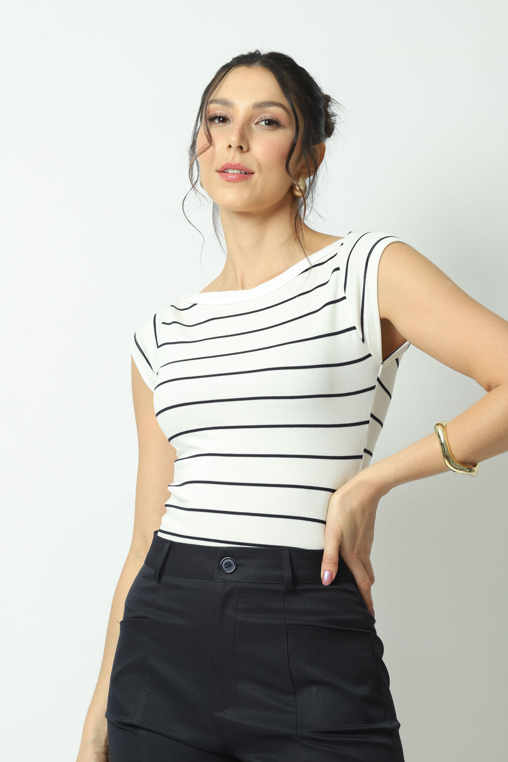Descrição Blusa listrada com decote canoa, manga curta, modelagem justa e comprimento regular. Confeccionada em uma malha canelada listrada com mistura de viscose e elastano com toque macio e elasticidade.
