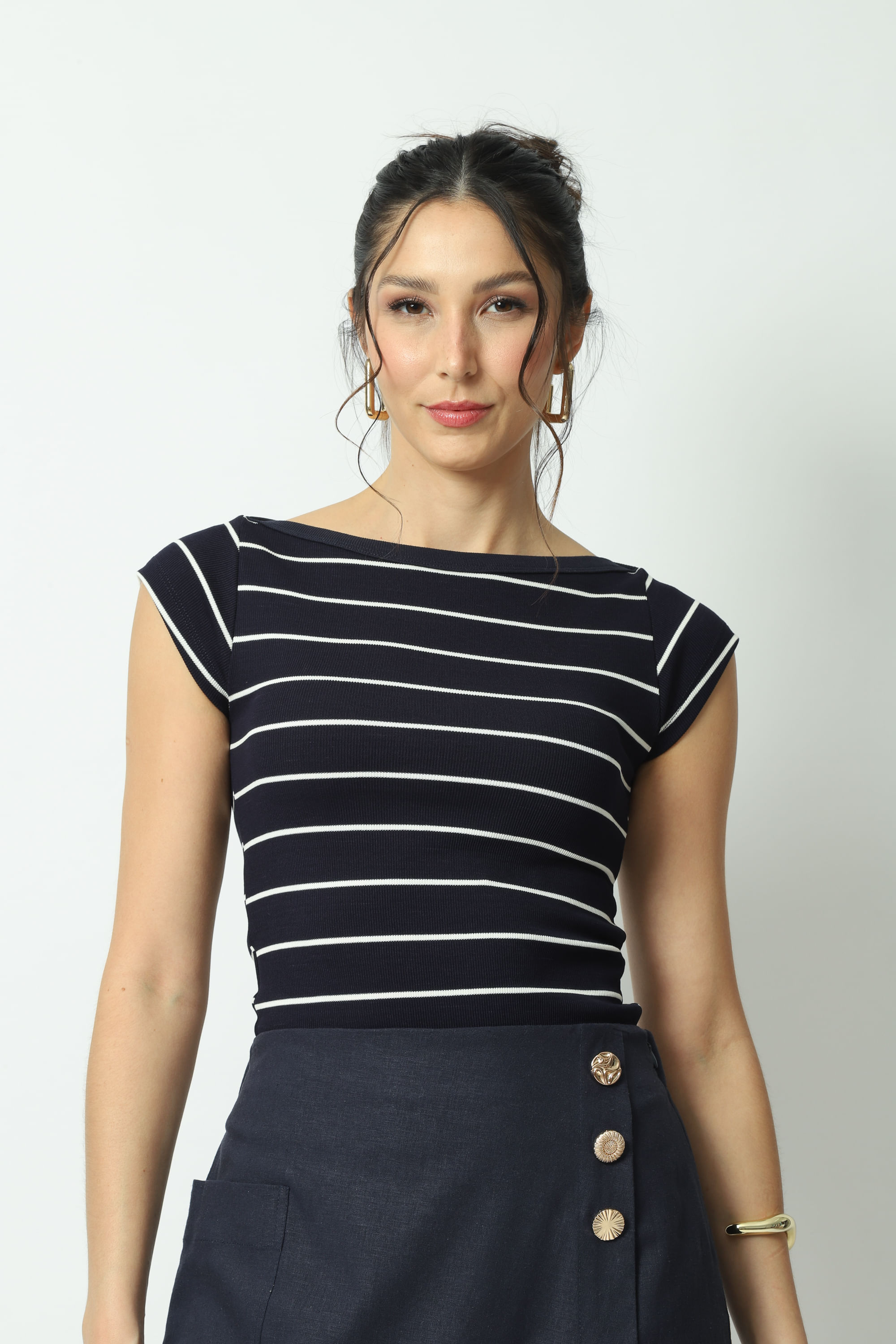 Descrição Blusa listrada com decote canoa, manga curta, modelagem justa e comprimento regular. Confeccionada em uma malha canelada listrada com mistura de viscose e elastano com toque macio e elasticidade.