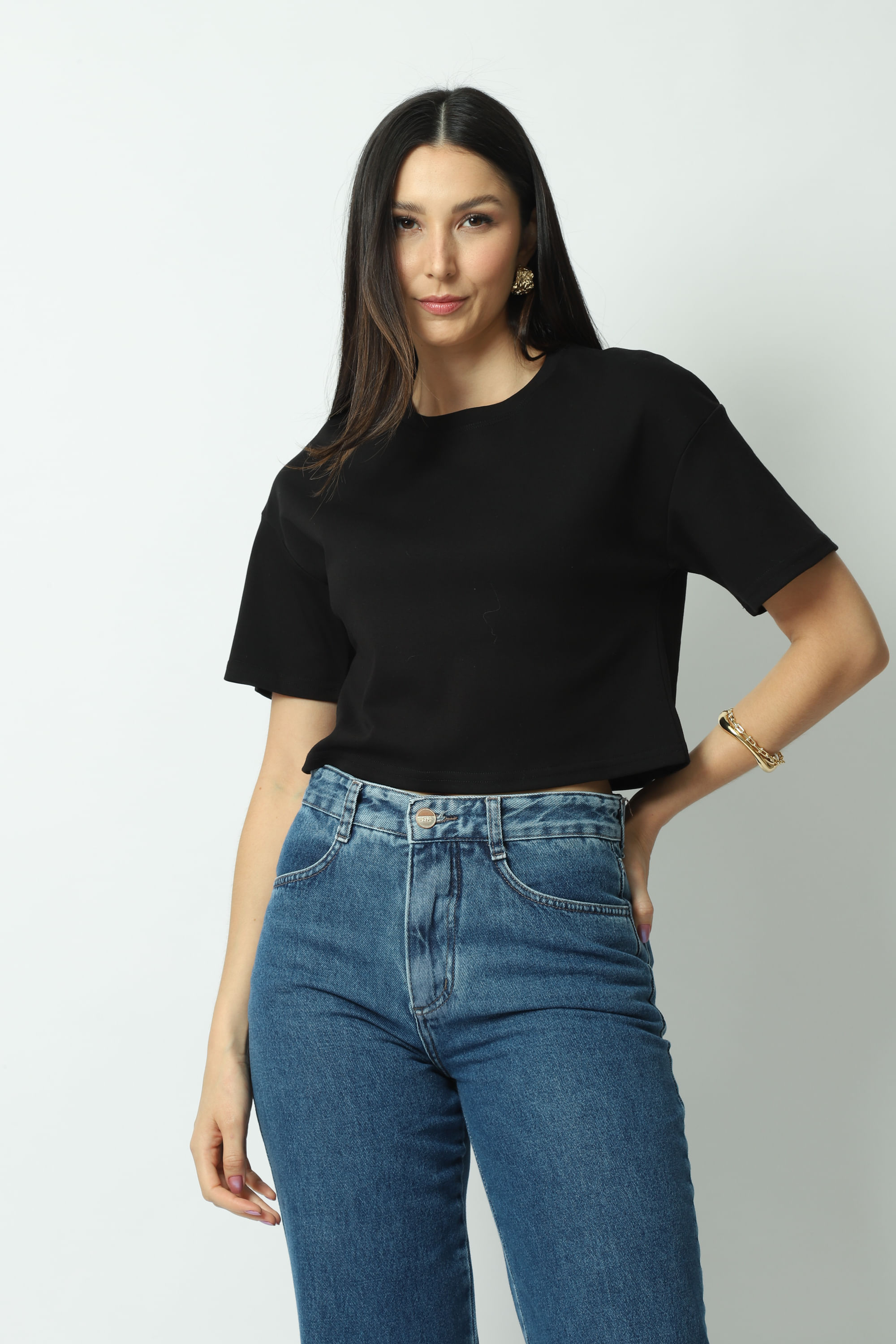 Blusa manga curta, gola redonda, comprimento cropped e modelagem reta. Tecido leve com toque extremamente macio. Confeccionado em algodão Pima, conhecido pela sua suavidade e durabilidade. Maciez e brilho sedoso, e não forma bolinha.