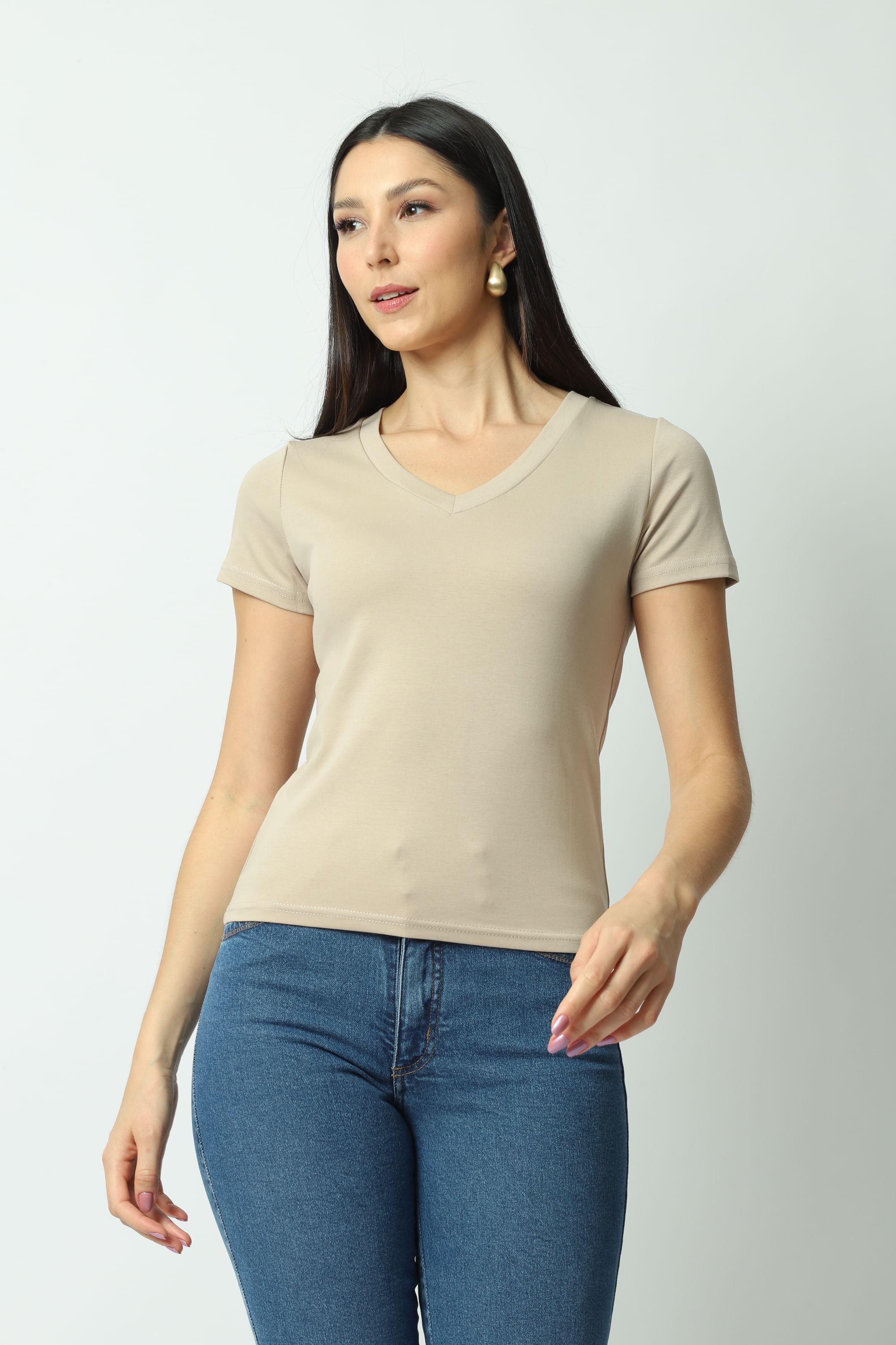 Blusa manga curta, decote V, comprimento regular e modelagem fit. Tecido leve com toque extremamente macio. Confeccionado em algodão Pima, conhecido pela sua suavidade e durabilidade. Maciez e brilho sedoso, e não forma bolinha.