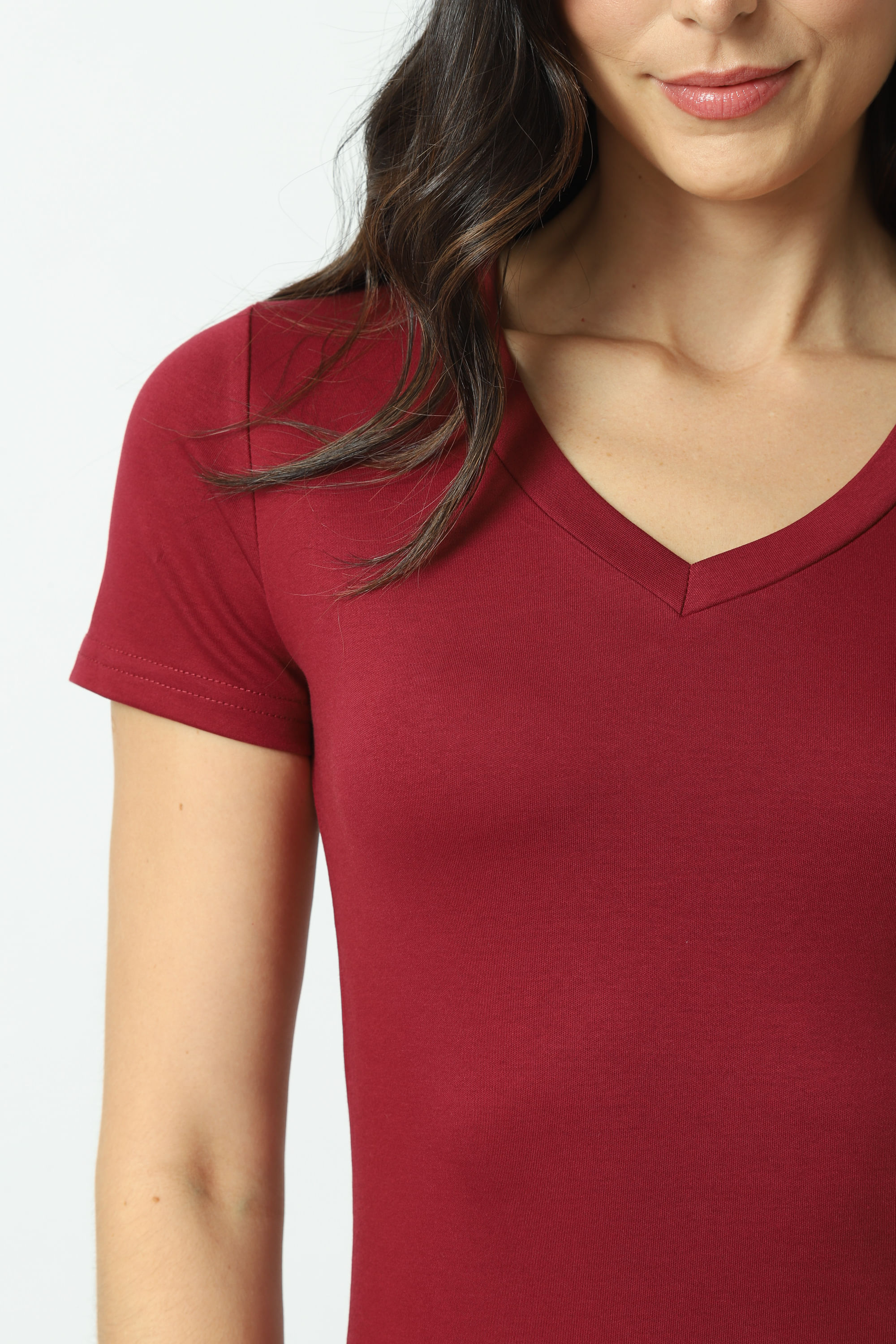 Descrição Blusa manga curta, decote V, comprimento regular e modelagem fit. Tecido leve com toque extremamente macio. Confeccionado em algodão Pima, conhecido pela sua suavidade e durabilidade. Maciez e brilho sedoso, e não forma bolinha.