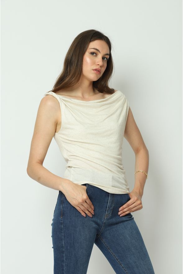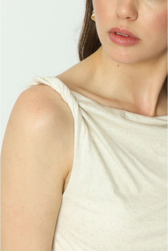 Descrição Blusa com ombro caído, um ombro de alça ampla e detalhe de drapeado, e outro com detalhe de torção. Modelagem reta com shape mais soltinho. Confeccionada em uma malha canelada com mistura de viscose, linho e elastano com toque suave.