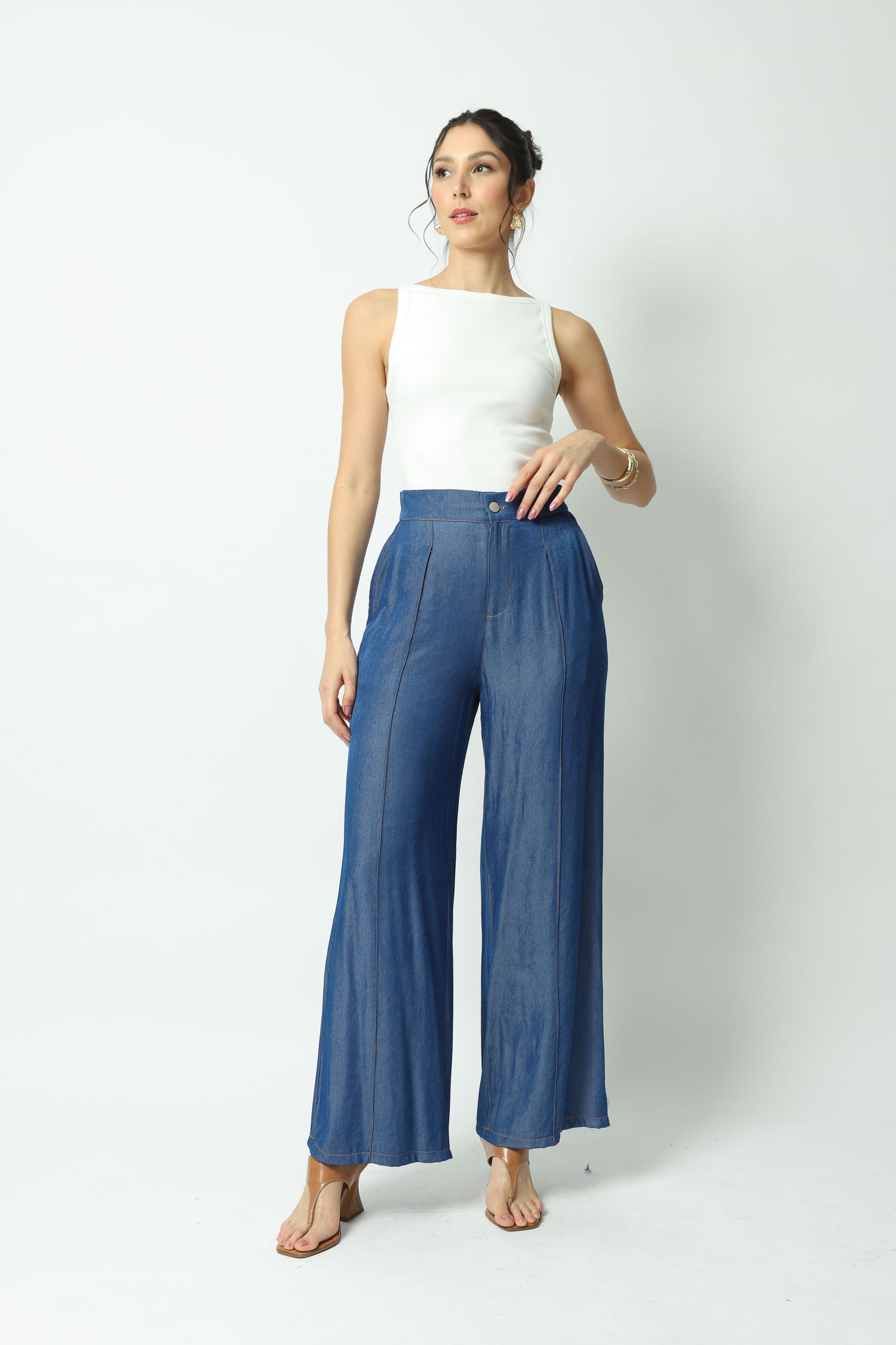 Calça cintura alta, comprimento longo, bolso faca, nervura frontal, cós traseiro flexível por elástico, que se ajusta ao corpo vestindo com muito conforto. Jeans levinho e fluídocom mistura de poliéster e viscose. Modelagem reta com caimento perfeito.