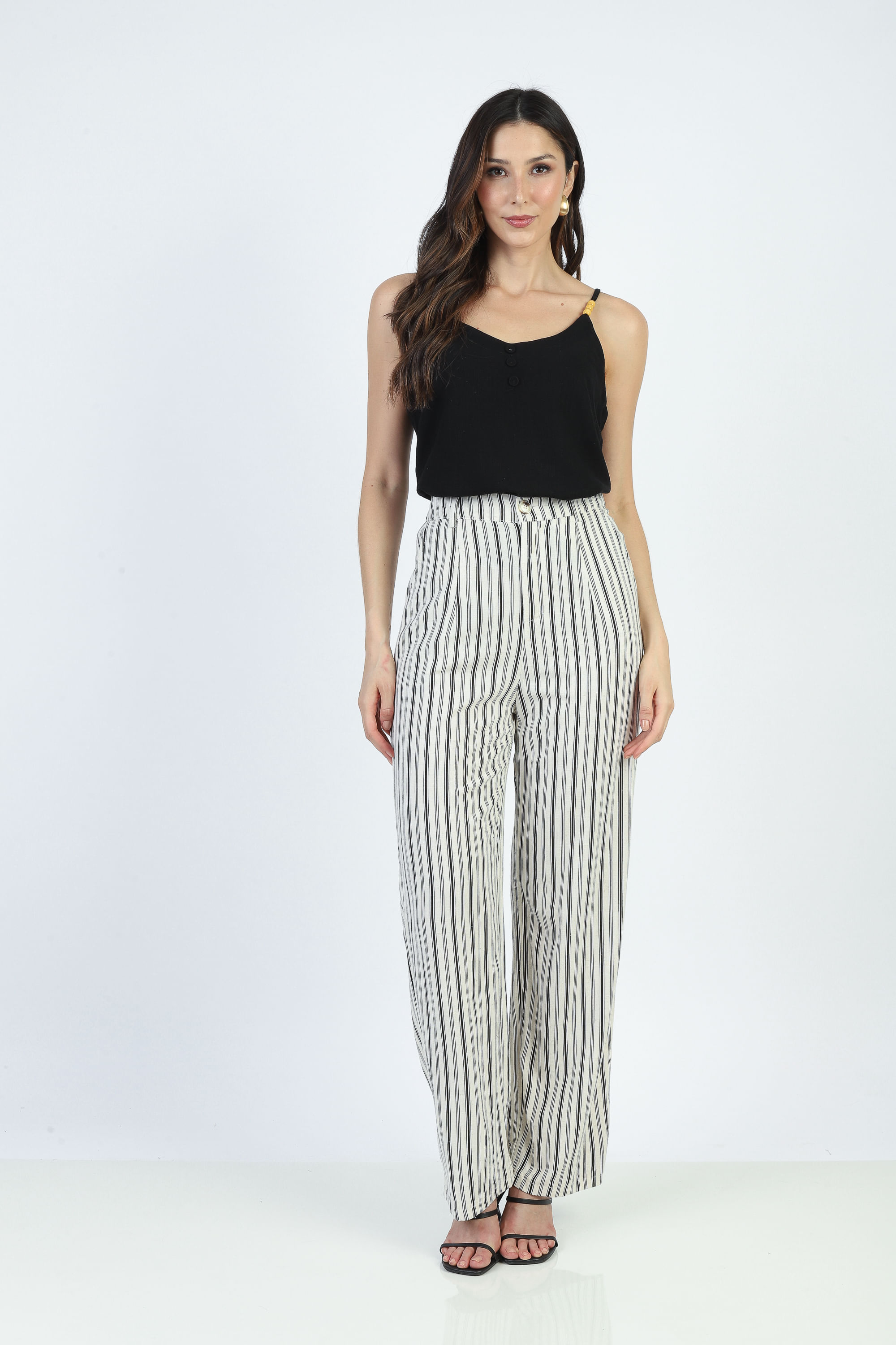 Calça alfaiataria, listras no sentido vertical, cintura alta, comprimento longo, bolsos tipo faca nas laterais, pence frente e costas, passante para cinto e fechamento frontal por zíper e botão. Calça confeccionada em uma mistura de viscose e linho combinando o frescor do linho e a suavidade da viscose.