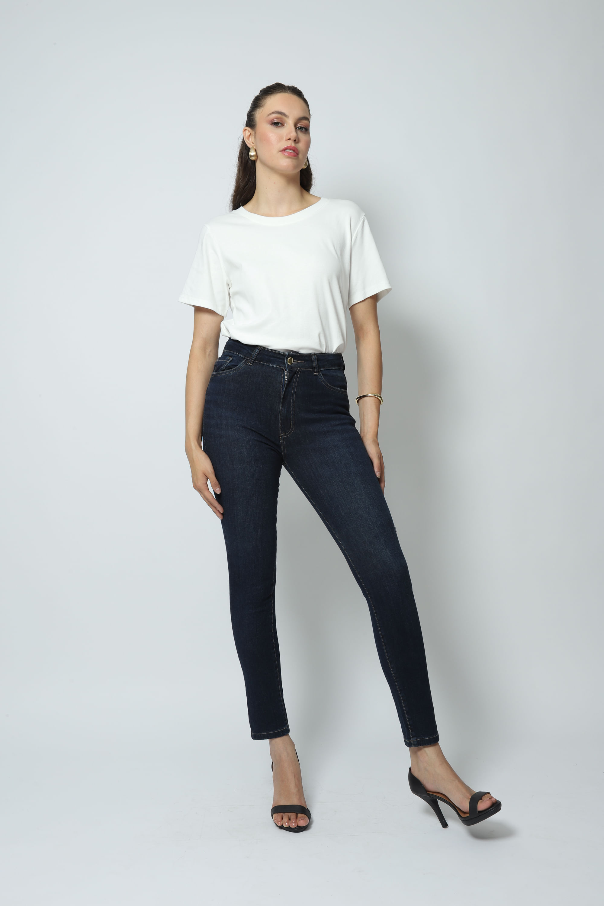 Calça Jeans Skinny Push Up, cintura alta, 5 bolsos, fechamento frontal por zíper e botão e passantes para cinto. Modelo push up é desenvolvido para valorizar o corpo na região posterior. Linha bielástico, que possui alto nível de elásticidade. Lavagem azul escuro.