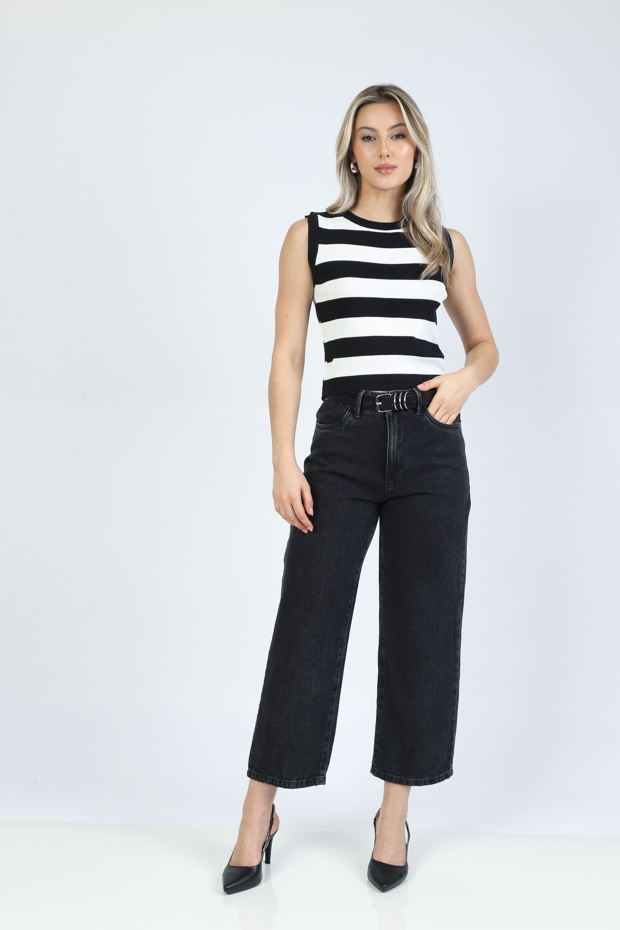 Calça jeans, cintura alta, comprimento cropped, 5 bolsos, passante para cinto e acompanha cinto. Fechamento frontal por zíper e botão. Modelagem Cropped. Jeans black sem elasticidade, 100% Algodão.