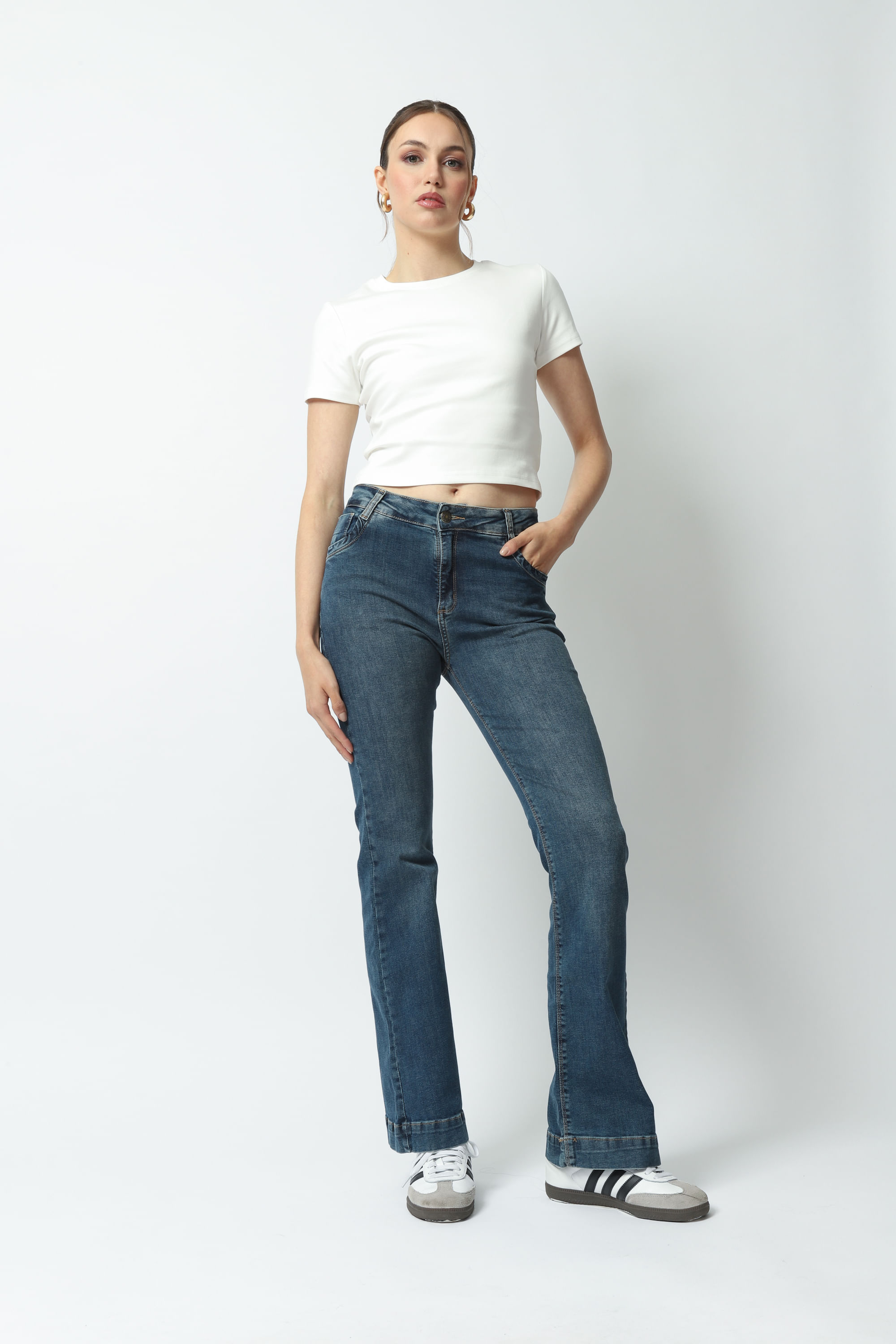 Calça Jeans modelo Boot Cut, cintura média, 5 bolsos, barra larga, fechamento frontal por zíper e botão. Modelagem justa até o joelho e vai abrindo até a barra. Linha Extreme Stretch que possui um alto nível de elasticidade, dando um ajuste perfeito ao corpo. Lavagem azul médio.