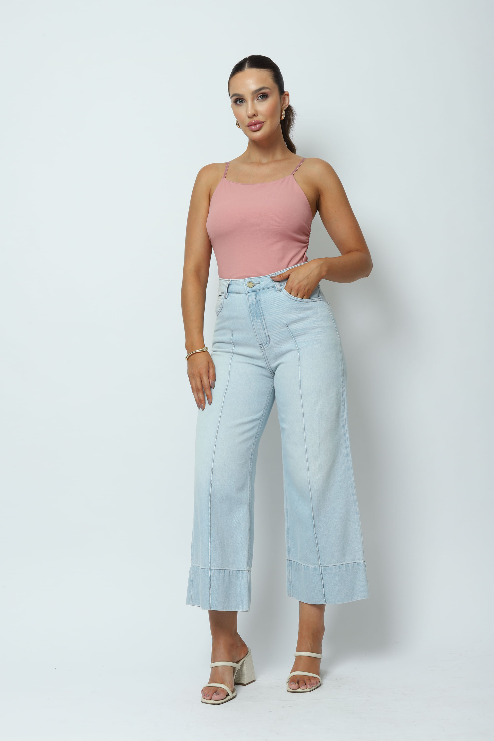 Calça Jeans de comprimento cropped, cintura alta, modelagem reta, nervuras na frente, 5 bolsos, cós com passante e acompanha cinto. Jeans sem elasticidade, 100% Algodão. Lavagem azul claro.