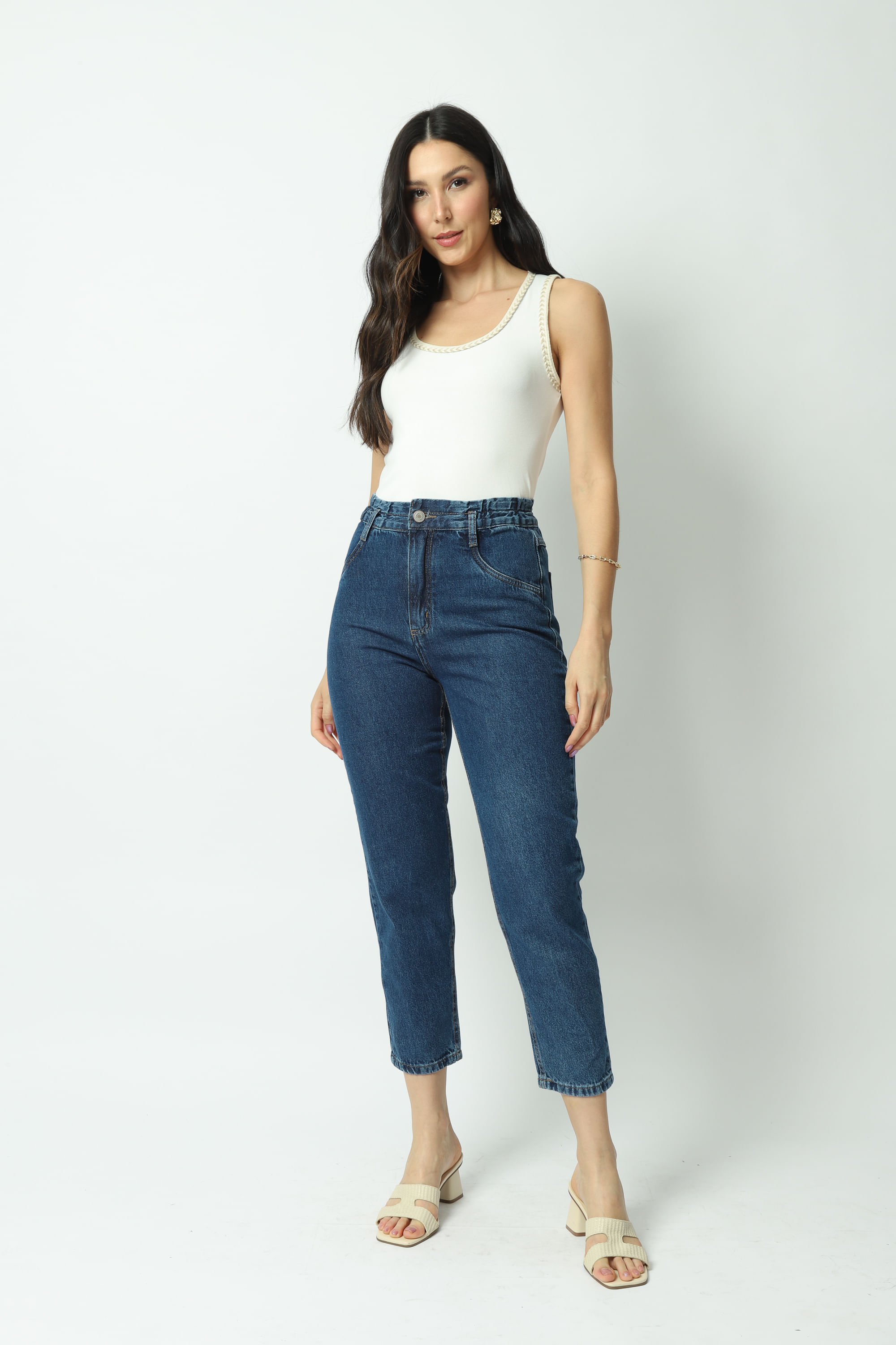 Calça jeans mom clochard, cintura alta, bolso traseiro, fecho frontal com zíper e botão de metal, passante para cinto e cós elástico para um ajuste confortável. Modelagem na região do quadril mais solta e barra mais ajustada. Jeans sem elasticidade, Linha 100% Algodão. Lavagem escura.