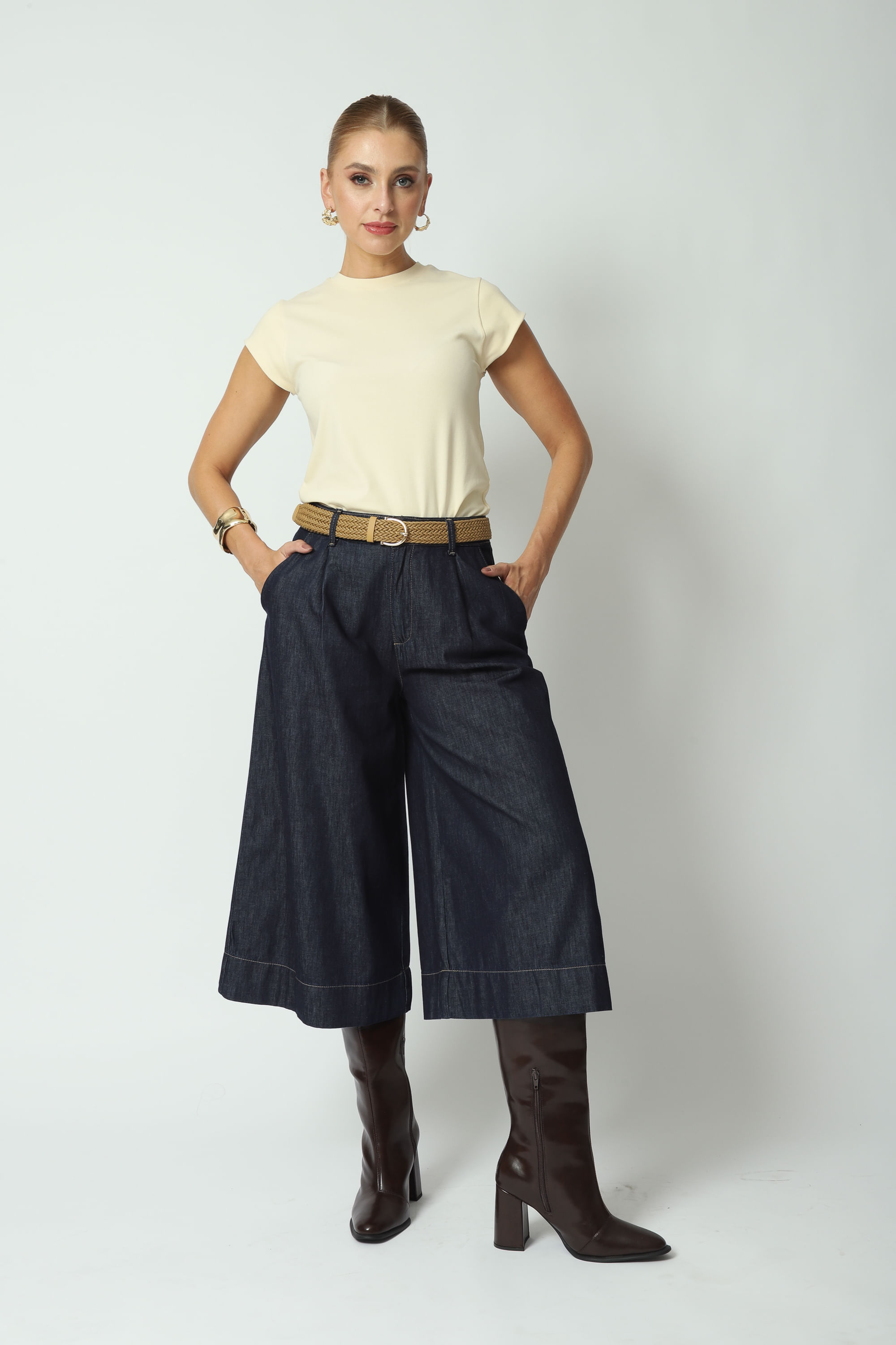 Calça jeans alfaiataria cintura alta, bolso faca, pregas na frente, comprimento pantacourt e barra larga. Cós com passantes, fechamento frontal por zíper e botão. Jeans leve e fluído confeccionado em 100% algodão. Lavagem azul escuro. Acompanha cinto.