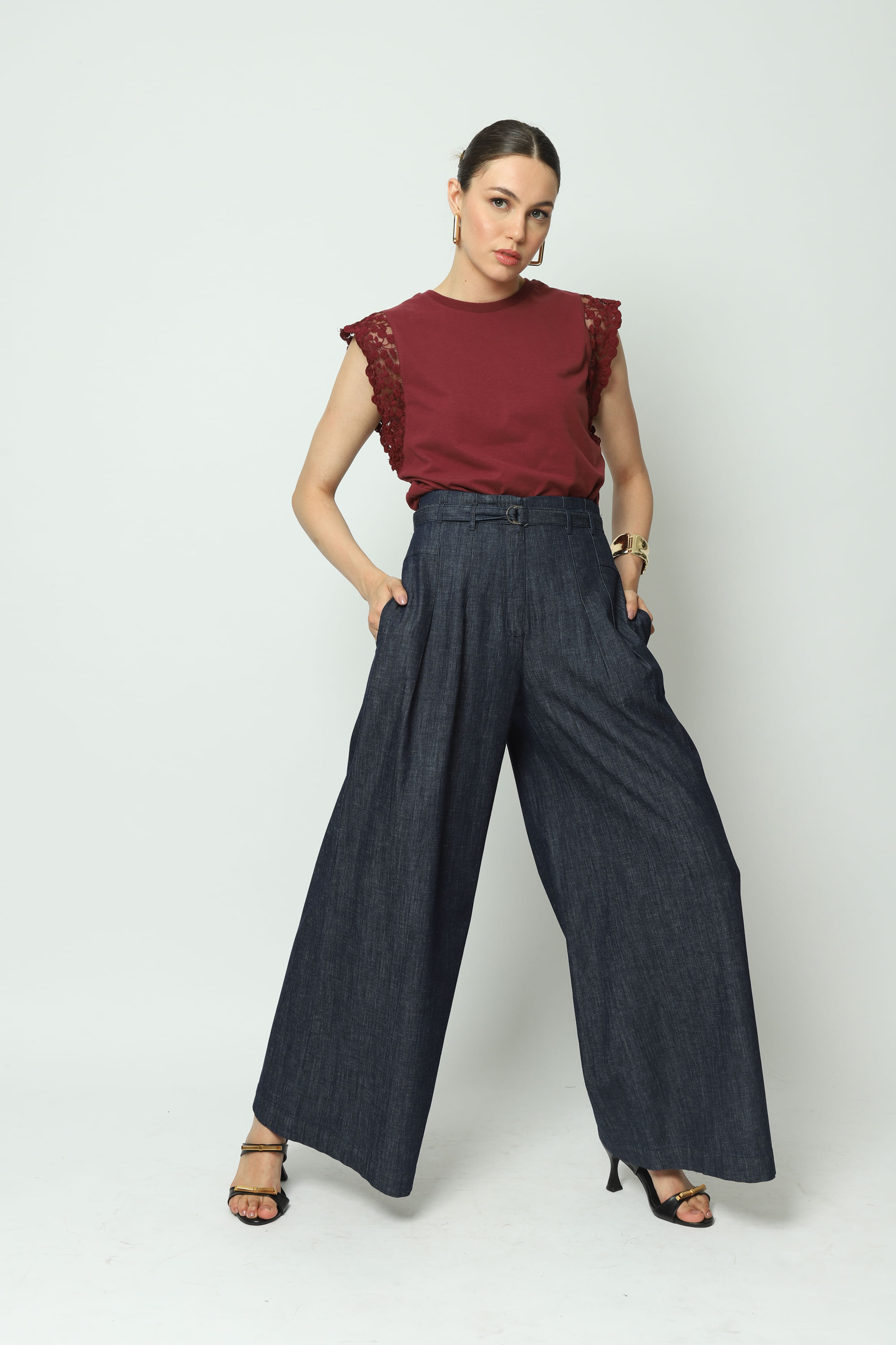 Calça jeans alfaiataria, cintura alta, modelagem pantalona, bolsos laterais, pregas frontais, passantes para cinto e possui fechamento frontal com zíper e cinto do próprio tecido. Jeans amaciado intensificando seu tom de azul escuro. Confeccionada em um tecido jeans leve e maleável, com uma mistura de algodão e elastano. Linha Comfort