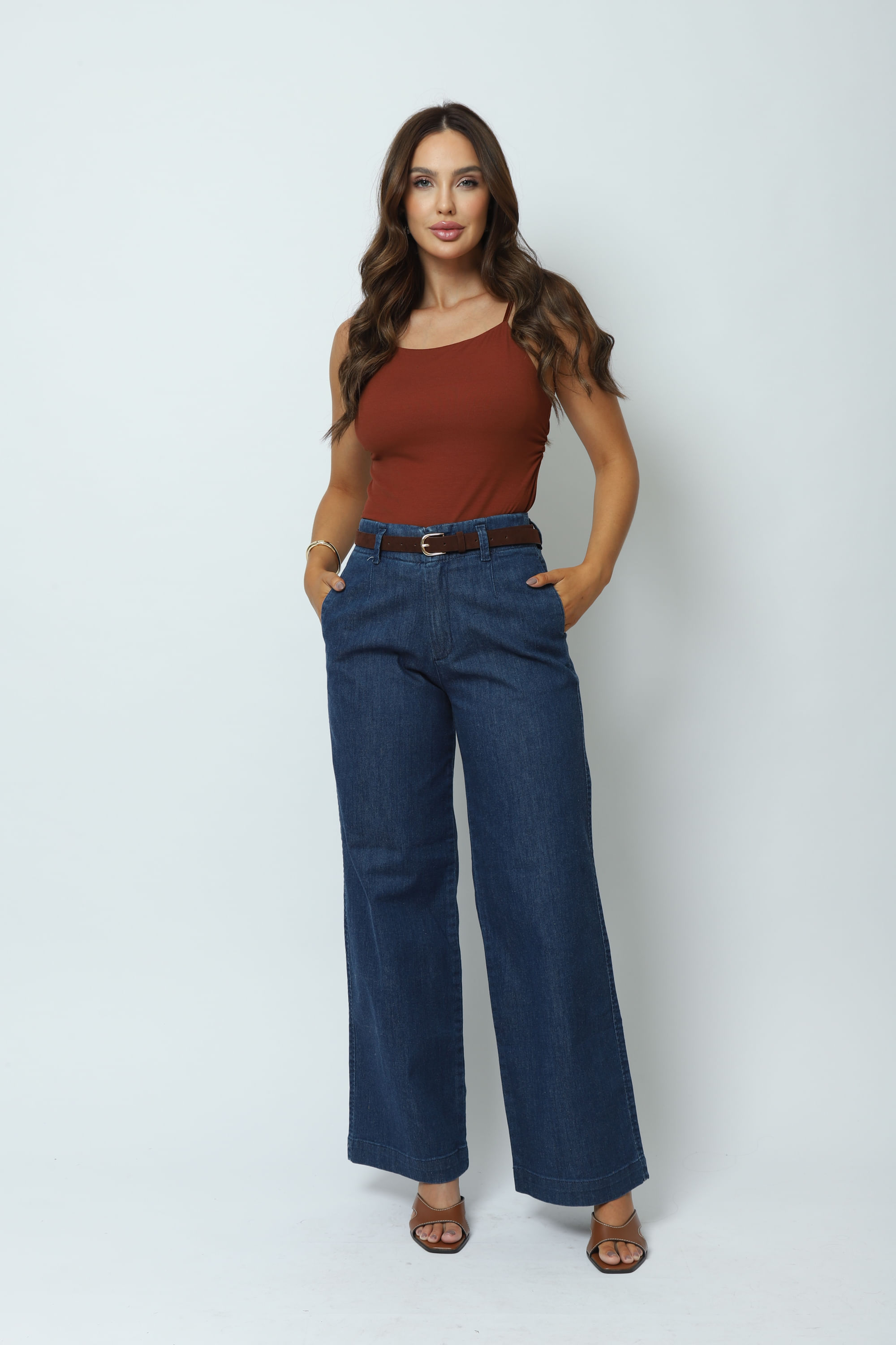 Calça jeans, cintura alta, comprimento longo, bainha larga, bolsos laterais e traseiros, modelagem reta, passantes e acompanha cinto. Linha Comfort que possui pouco elastano para dar aquele conforto e mobilidade para o dia a dia. Lavagem média.