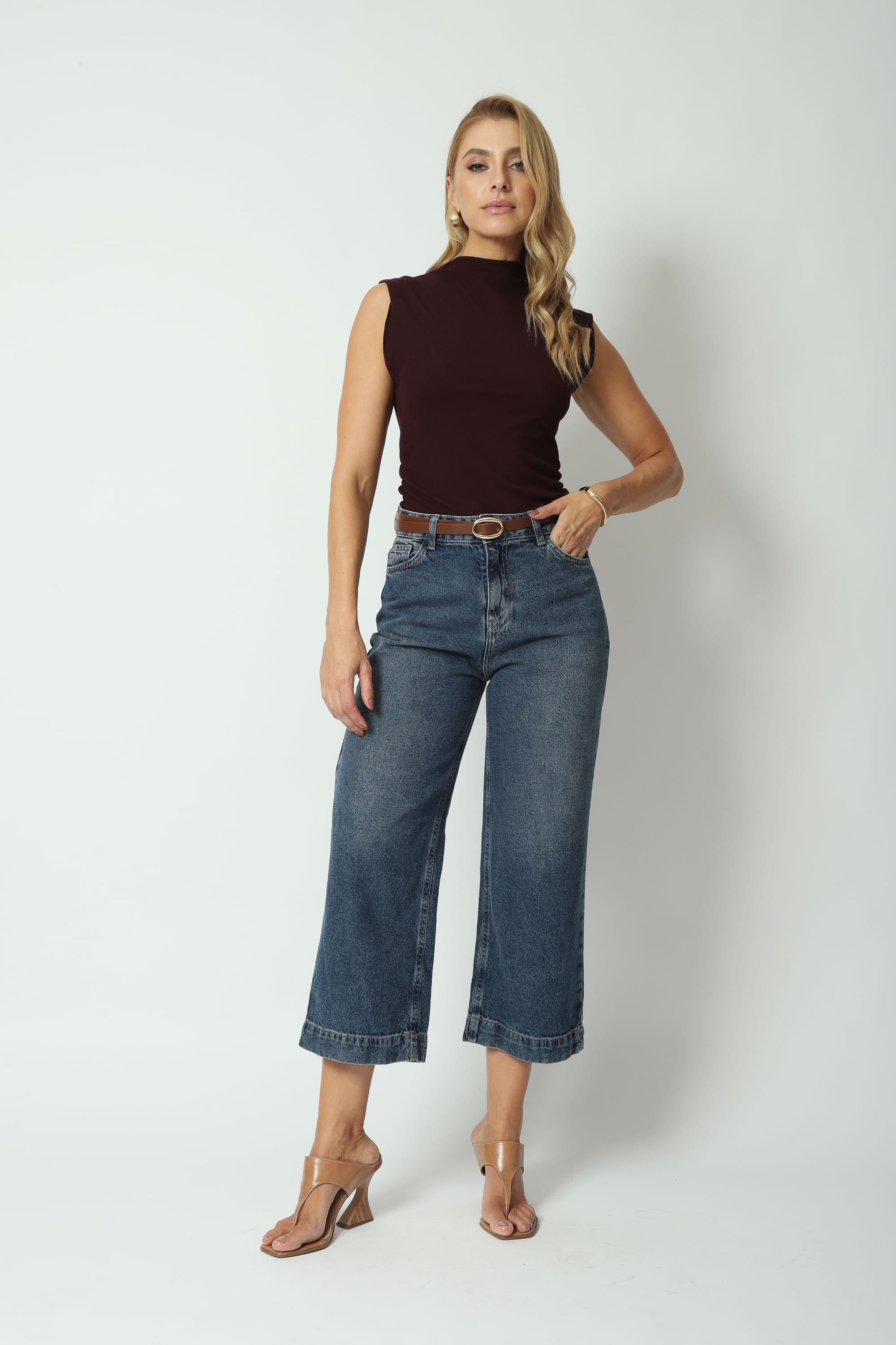 Calça Jeans reta slim de comprimento cropped, cintura média, 5 bolsos, cós com passante e fechamento frontal por zíper e botão. Jeans sem elasticidade, 100% algodão. Acompanha cinto.