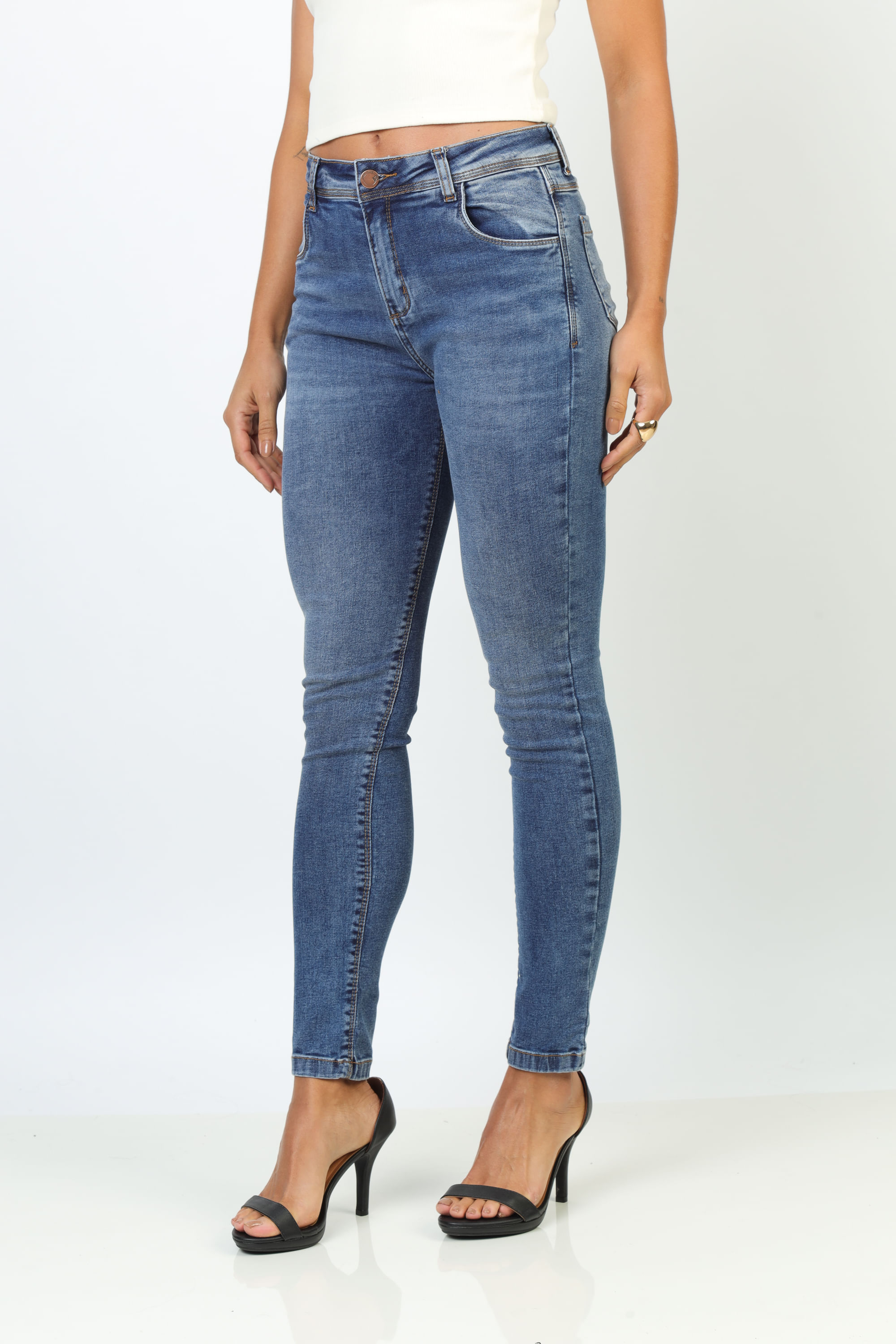 Calça skinny de cintura média, 5 bolsos, passante para cinto, comprimento longo, modelagem skinny e fechamento frontal por zíper e botão. Linha Extreme Stretch que possui um alto nível de elasticidade, dando um ajuste perfeito ao corpo. Lavagem azul médio.