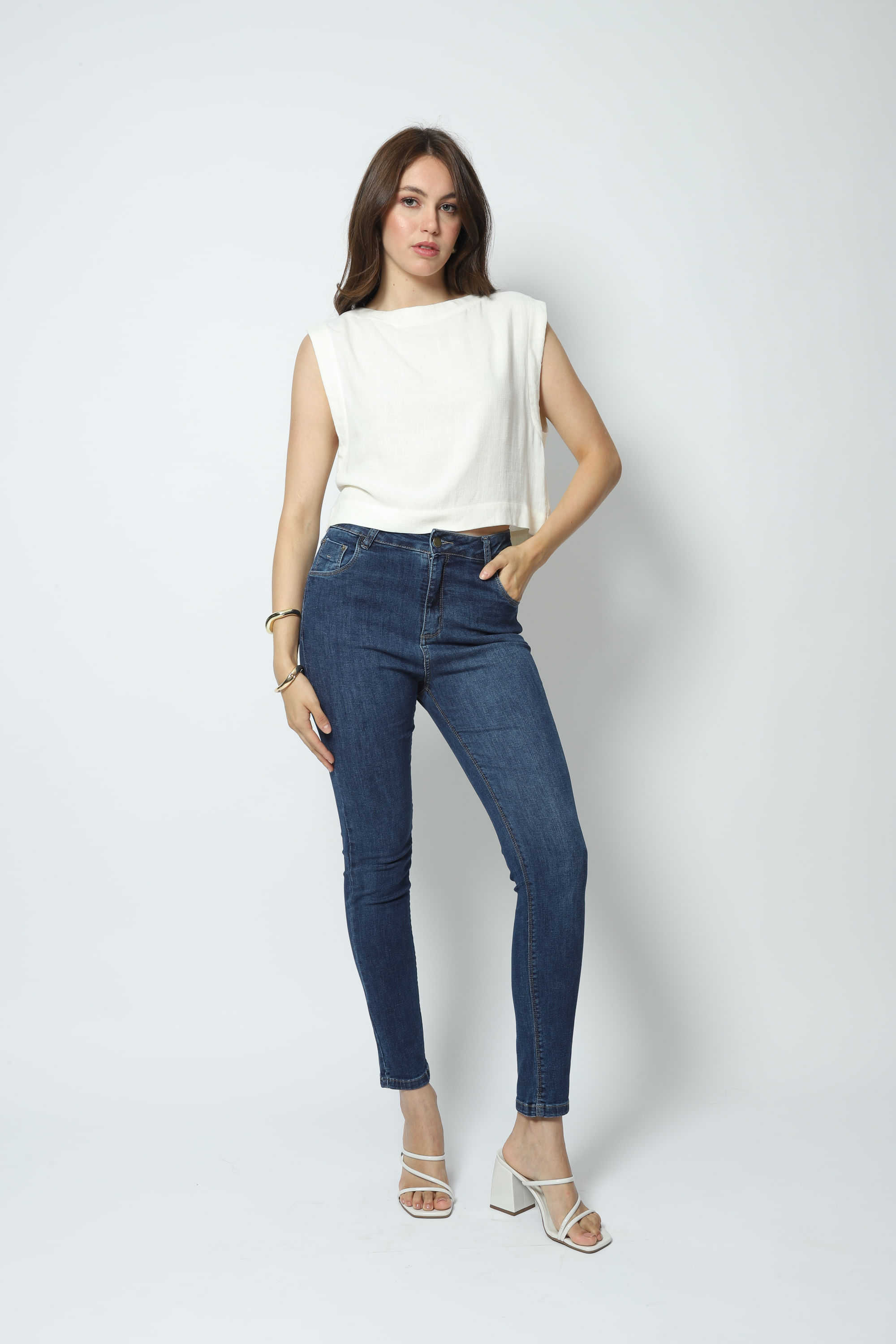 Calça jeans skinny, cintura alta, comprimento longo, 5 bolsos, passantes para cinto e fechamento frontal com zíper e botão. Linha Extreme Stretch que possui um alto nível de elasticidade, dando um ajuste perfeito ao corpo. Lavagem azul escura.