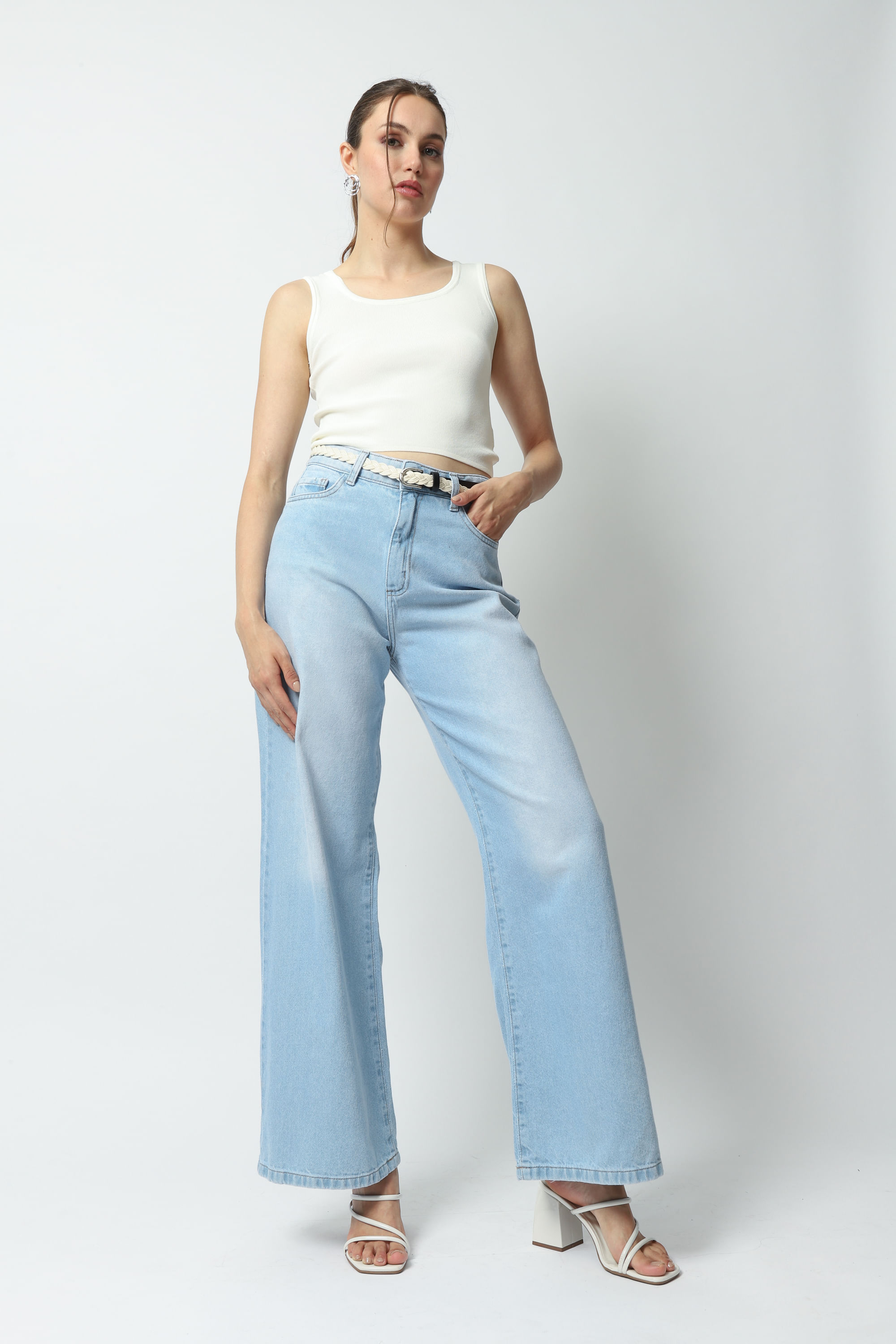 Descrição Calça Jeans modelagem Wide Fit, cintura alta, possui 5 bolsos, fecho frontal por zíper e botão, comprimento longo, cós com passante para cinto e acompanha cinto. Lavagem azul claro. Jeans sem elasticidade, confeccionado em tecido 100% Algodão.