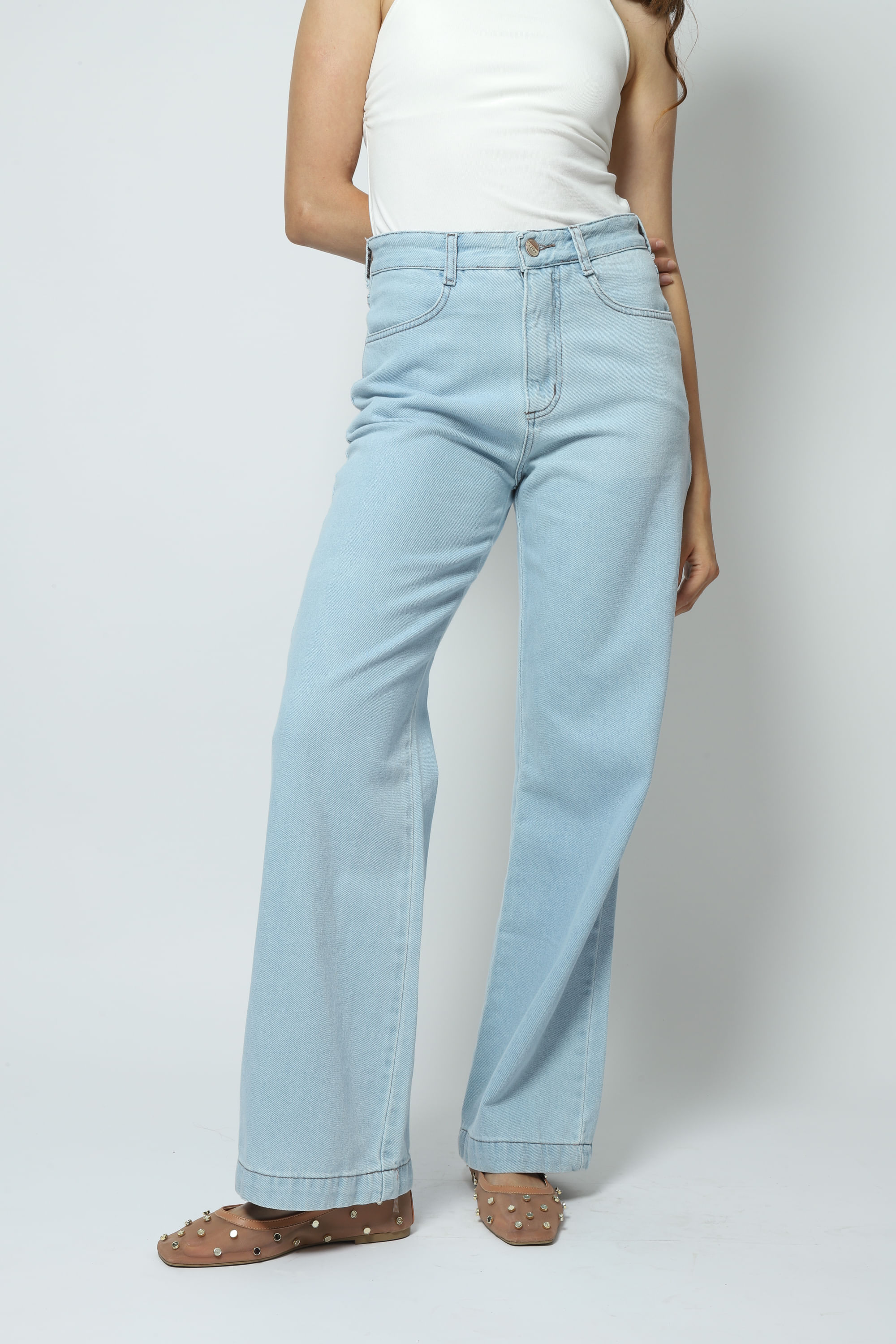 Calça jeans wide slim, de cintura alta, bolsos frontais e posteriores, comprimento longo, passantes para cinto e fechamento frontal por zíper e botão. A peça tem a modelagem wide leg, com construção reta e o caimento é confortavelmente solto ao corpo. Linha 100% Algodão. Lavagem azul claro.