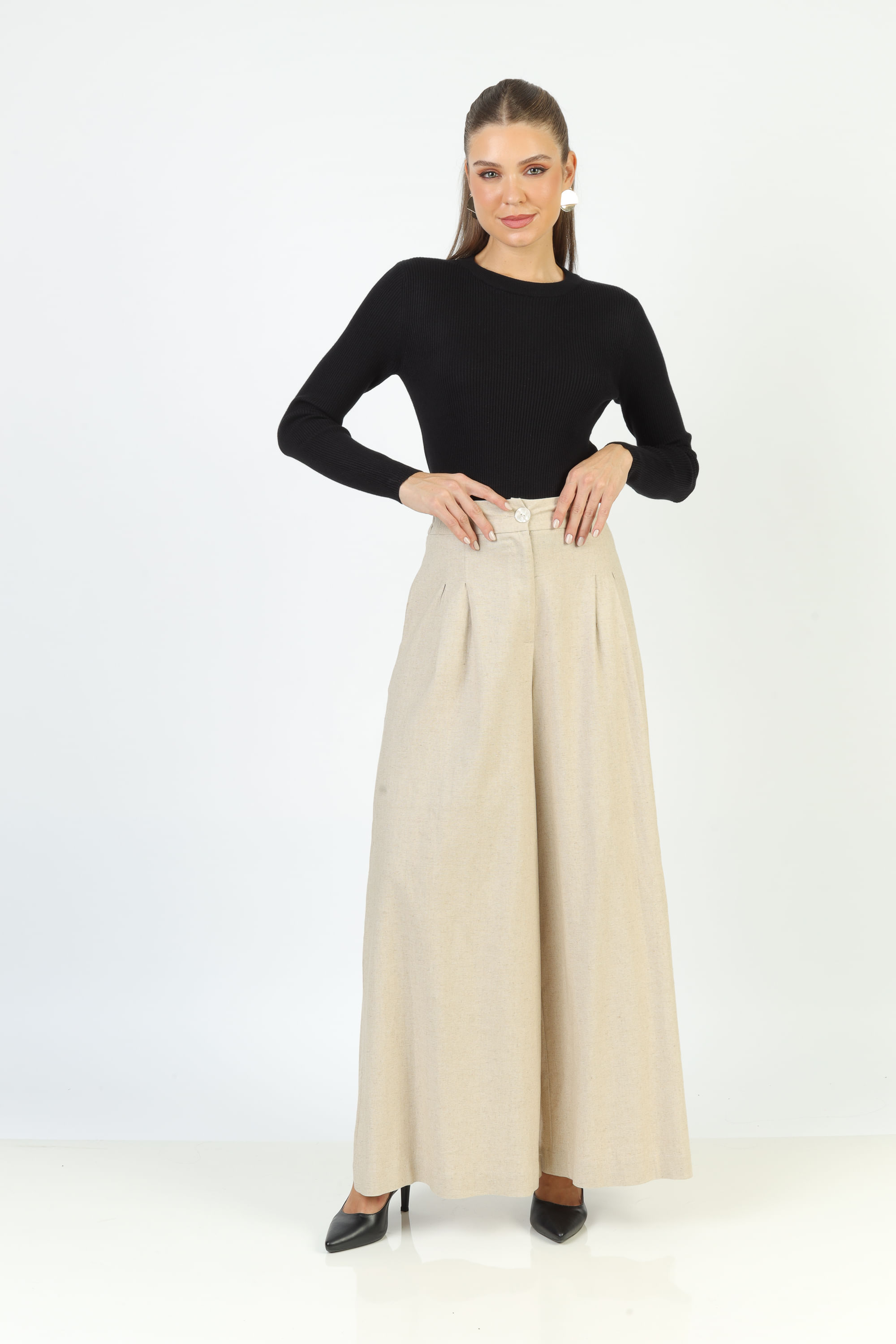 Calça Alfaiataria, cintura alta, modelagem pantalona, pregas na frente, bolsos laterais. Cós com passante, cós costas elástico para um ajuste perfeito e fechamento frontal por zíper e botão.