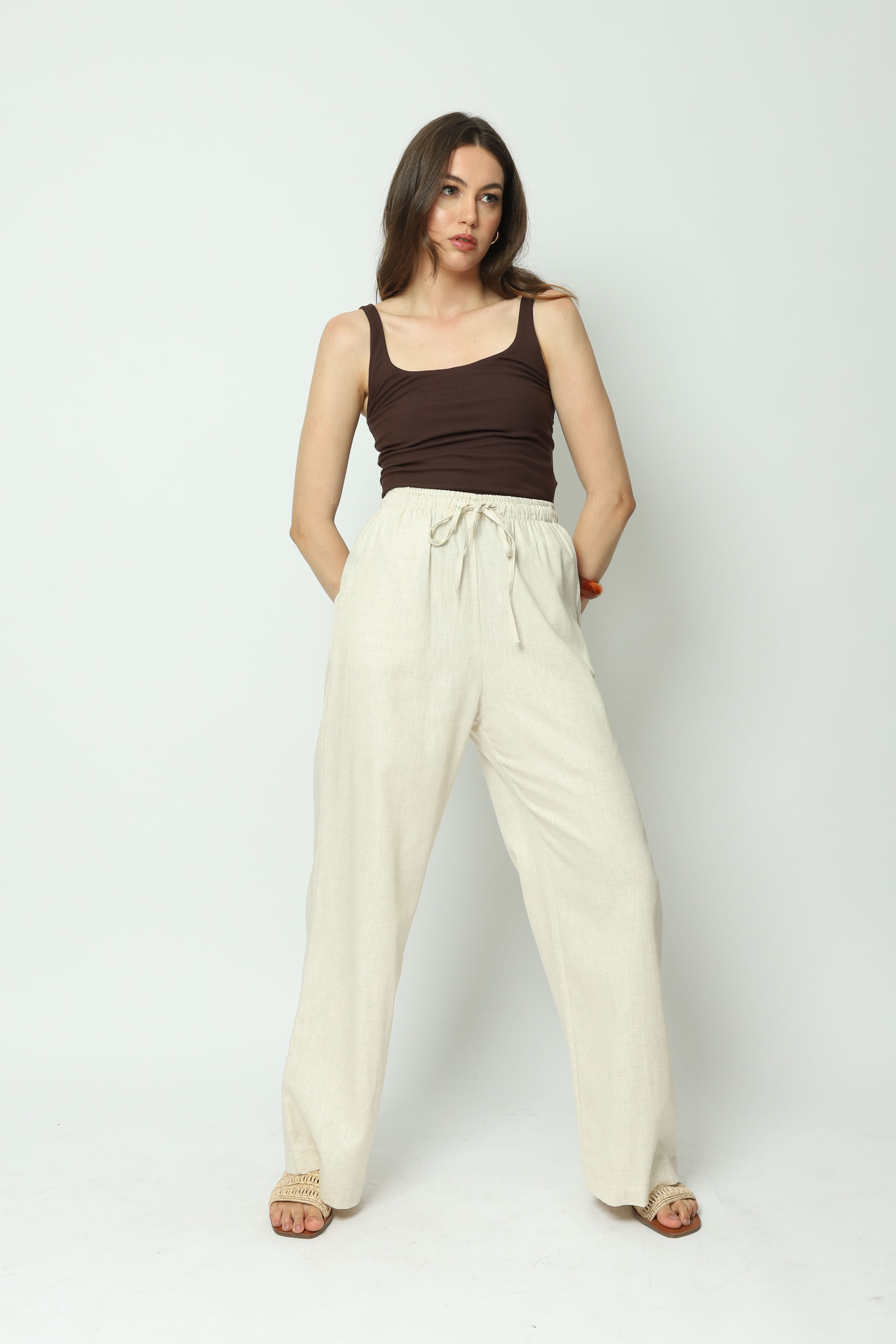 DescriçãoCalça cintura alta, comprimento longo, cós flexível por elástico e cordão para amarração, que se ajusta ao corpo vestindo com muito conforto. Modelagem reta, versátil com caimento perfeito.