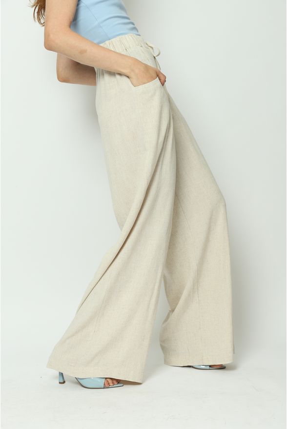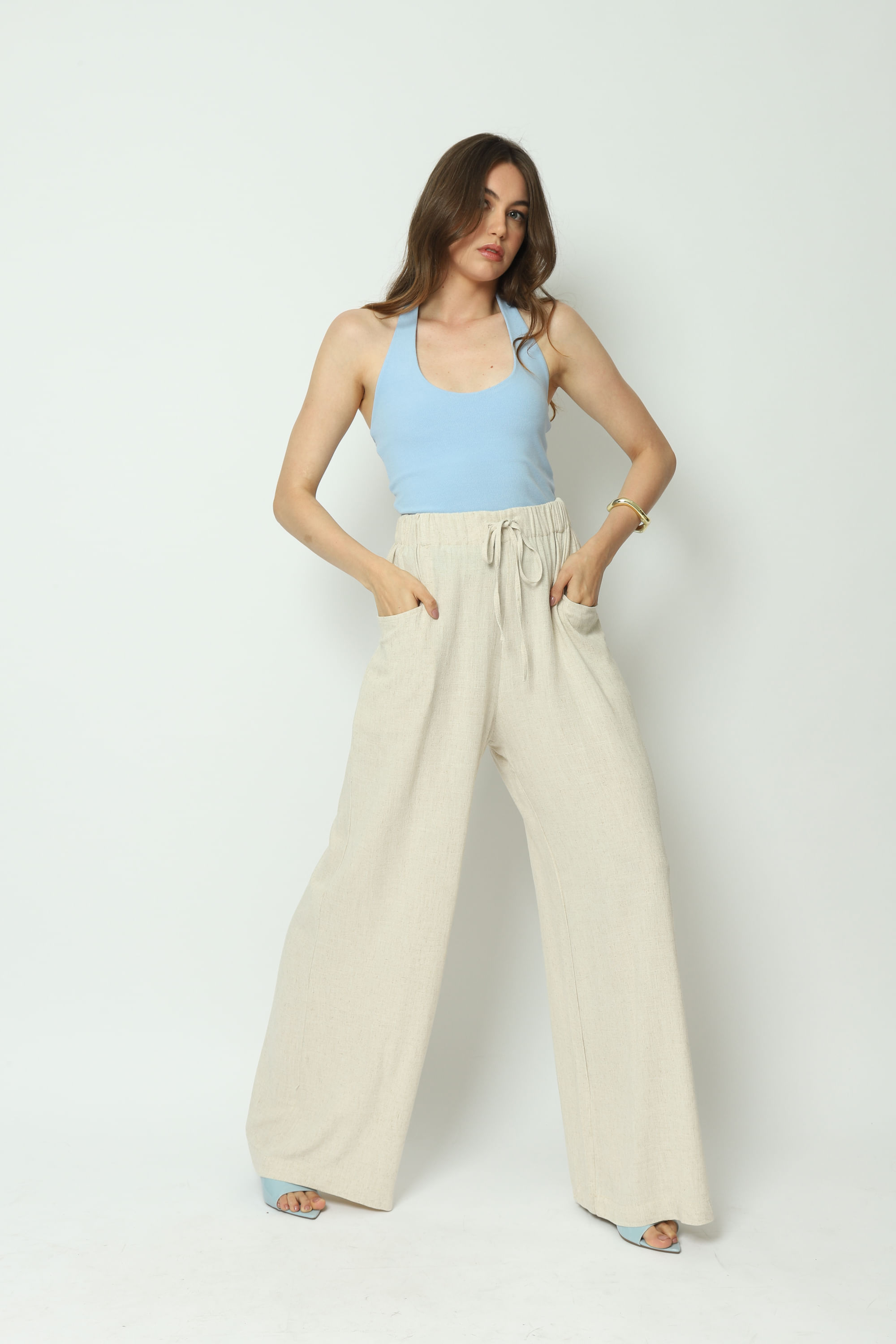 Calça lounge cintura alta, bolsos frontais, modelagem pantalona, comprimento longo, cós elástico e cordão para amarração para ajuste perfeito na cintura. Calça fluída e leve, confeccionada em uma mistura de viscose e linho, trazendo a suavidade da viscose e o frescor do linho.