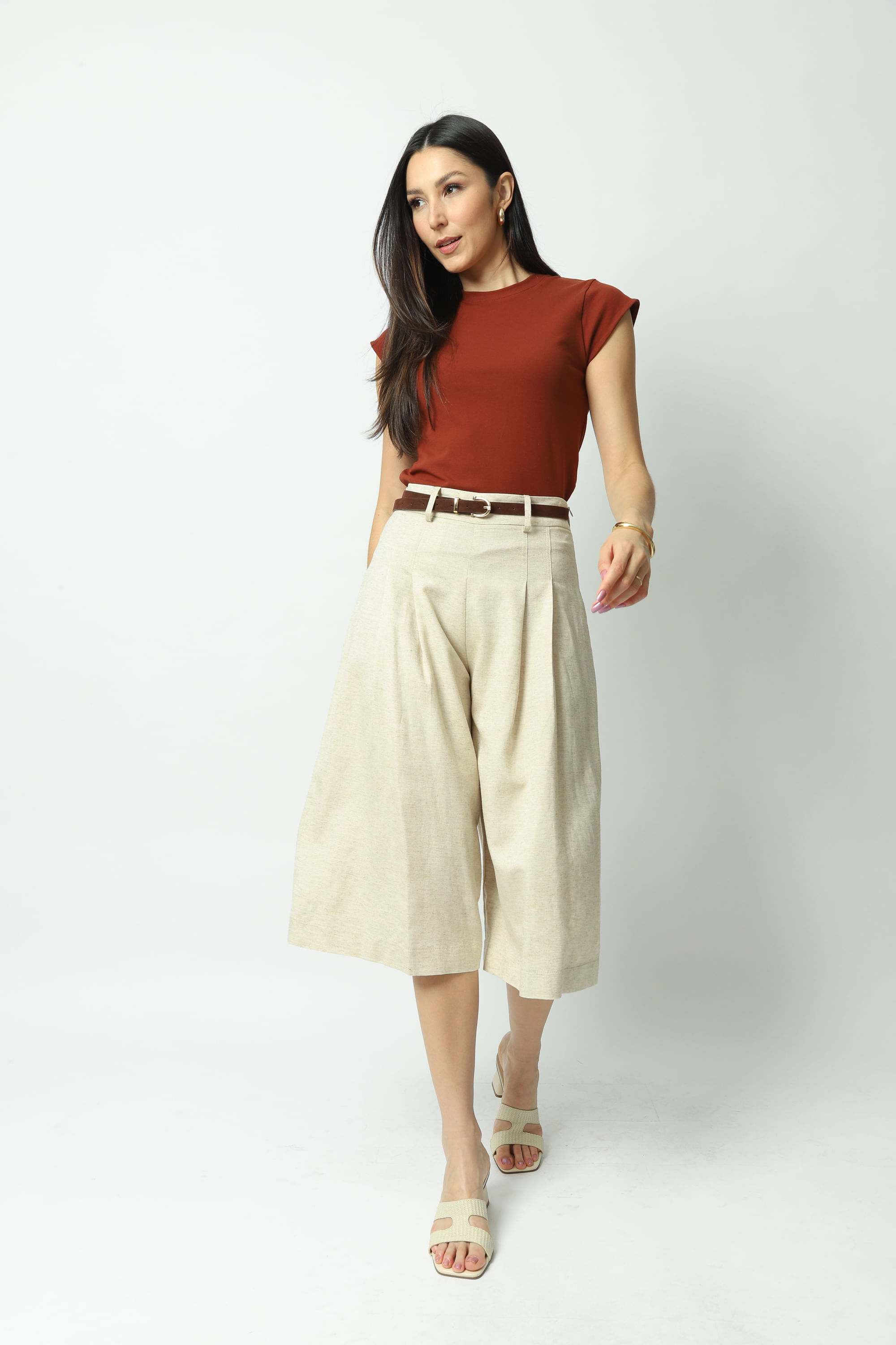 Calça comprimento midi, pregas na frente, cintura super alta, fechamento lateral por zíper invisível, cós com passantes e acompanha cinto. confeccionada em uma mistura de viscose, algodão e linho.