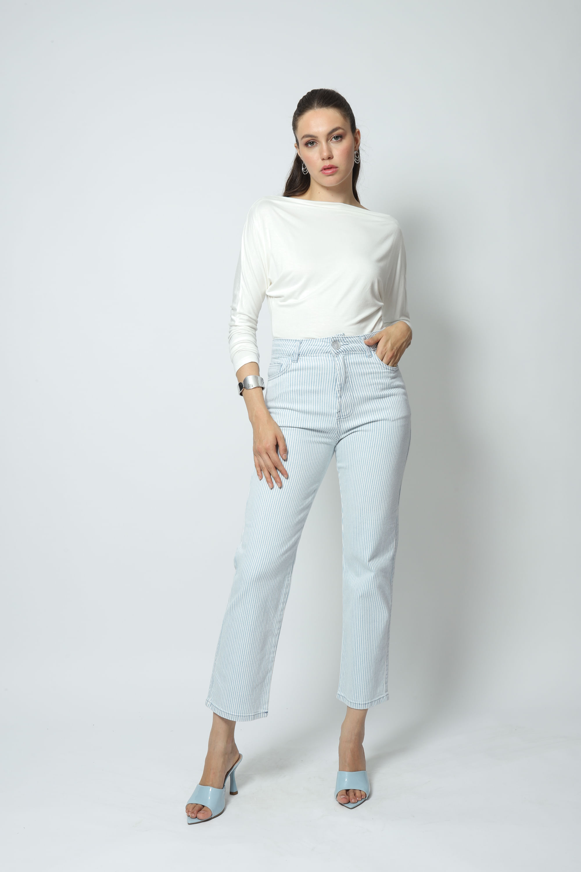 Calça em sarja listrada, cintura alta, fechamento frontal por zíper e botão, 5 bolsos e passantes para cinto. Calça confeccionada em uma sarja com pouco elastano, apenas para dar um conforto. Padronagem listrada atemporal, que adiciona um charme extra à produção.