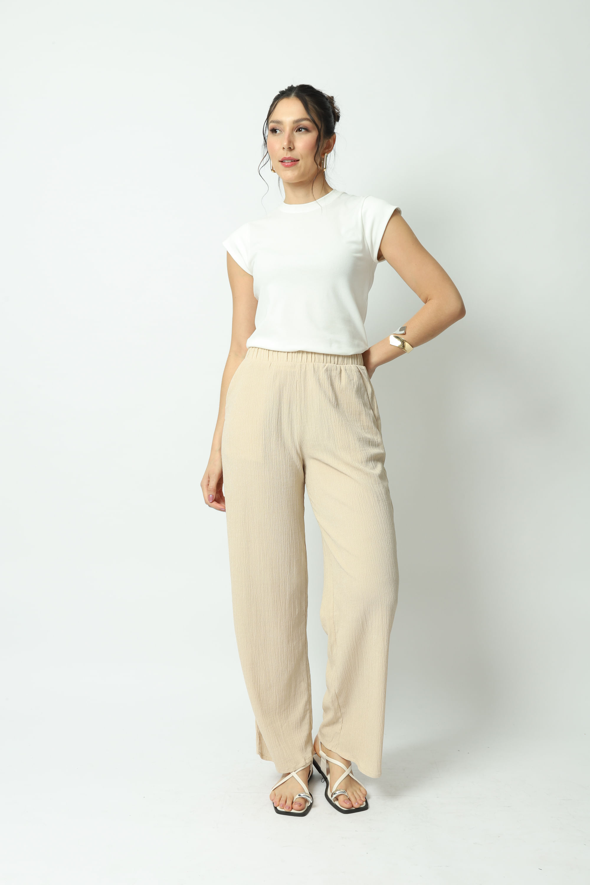 Calça modelagem reta, cintura alta, comprimento longo, bolso faca e cós flexível por elástico que se ajusta ao corpo vestindo com muito conforto . Tecido leve e texturizado.
