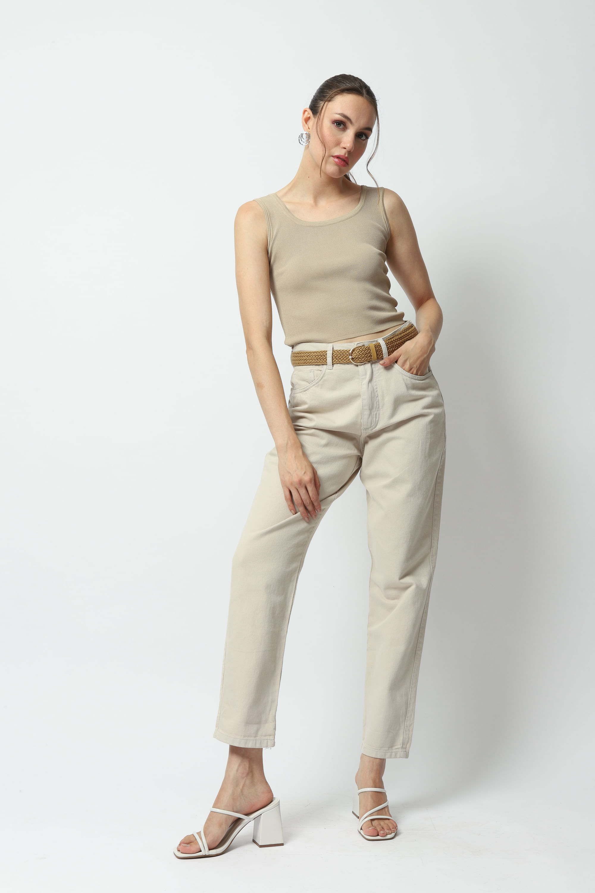 Calça Sarja Mom, cintura alta, 5 bolsos, fecho frontal com zíper e botão de metal, passantes e acompanha cinto. Modelagem na região do quadril mais solta e barra mais ajustada. Sarja sem elasticidade, Linha 100% Algodão.