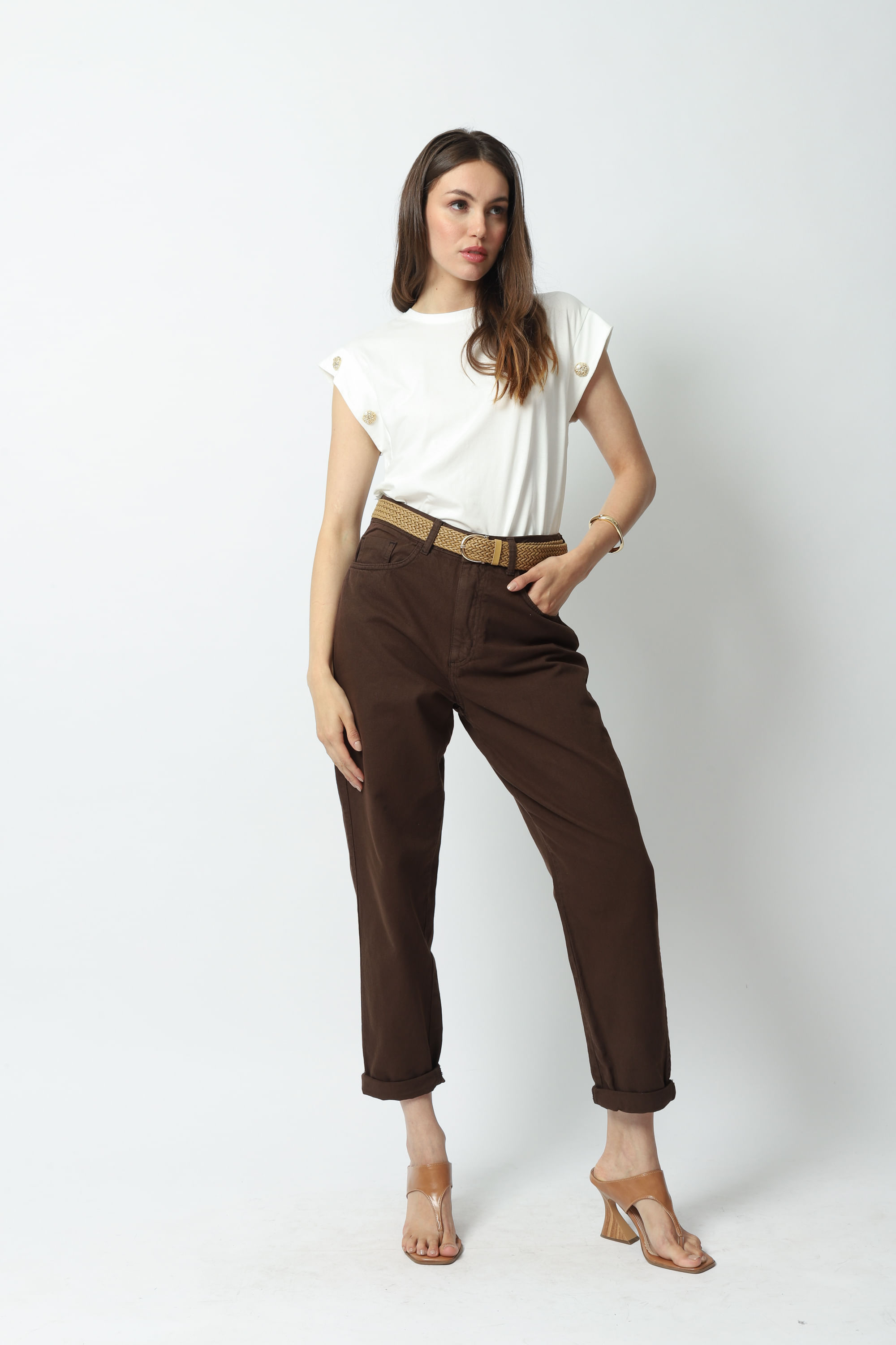 Calça Sarja Mom, cintura alta, 5 bolsos, fecho frontal com zíper e botão de metal, passantes e acompanha cinto. Modelagem na região do quadril mais solta e barra mais ajustada. Sarja sem elasticidade, Linha 100% Algodão.