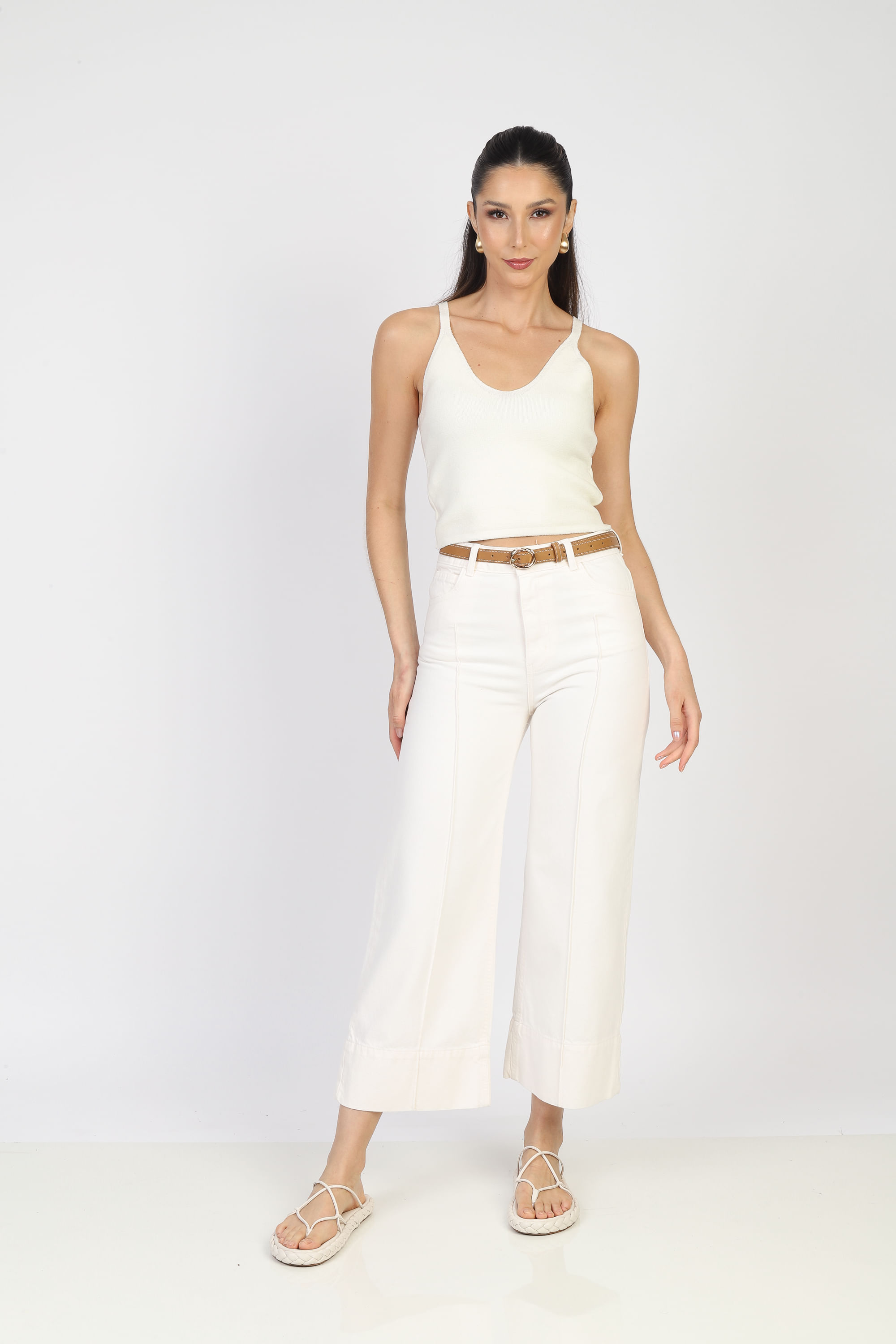Calça jeans, cintura alta, comprimento pantacourt, barra larga, nervuras na vertical frontal, 5 bolsos, passante para cinto e acompanha cinto. Fechamento frontal por zíper e botão. Calça sem elasticidade, 100% Algodão.