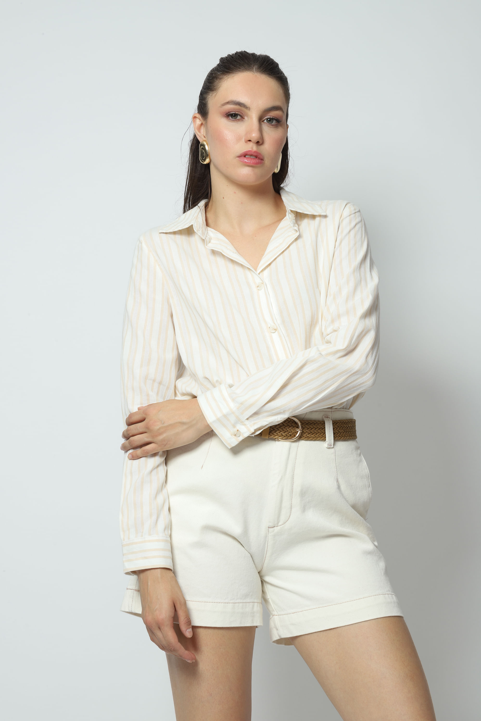 Descrição Camisa com padrão listrado, manga longa, silhueta solta ao corpo e fechamento vista e punhos por botões. Camisa confeccionada em 100% algodão, oferece um visual clássico e versatil.