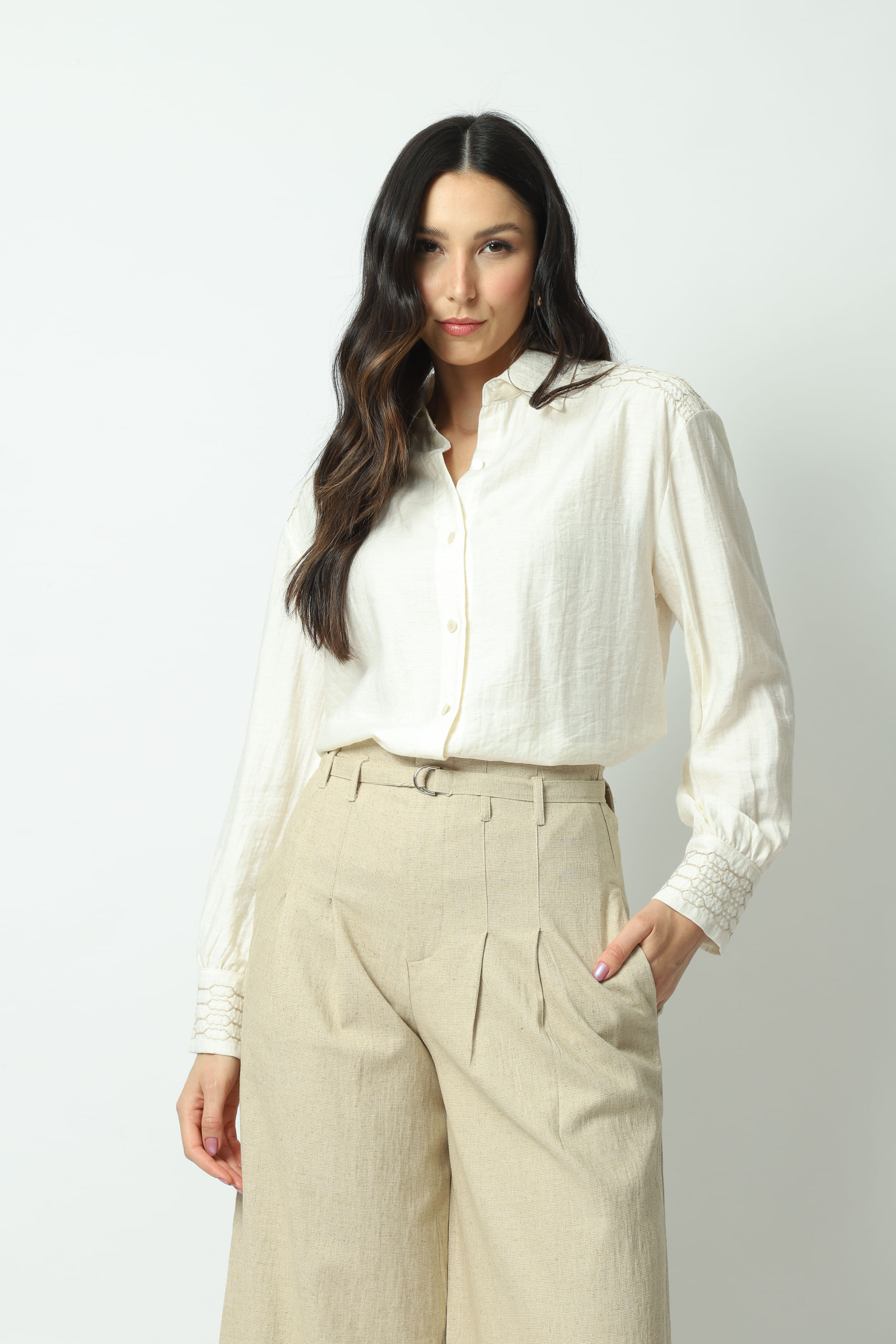 Camisa Manga longa com detalhe de bordado nos ombros e punhos, modelagem reta, vista e punho com fechamento em botões e comprimento clássico de camisa. Camisa com toque suave e fluído.