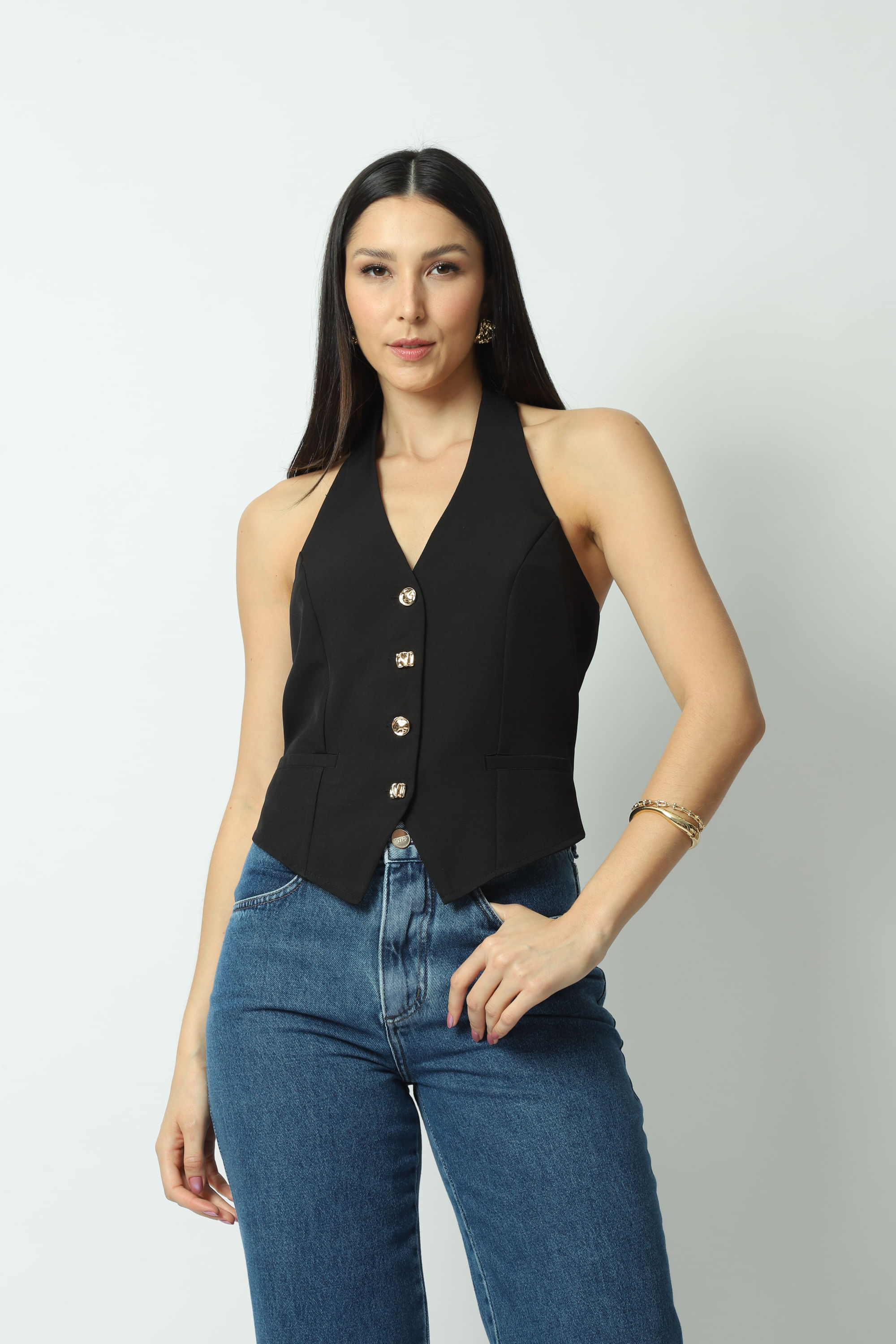 Colete alfaiataria frente única, decote V, fechamento frontal por botões em dourado, frente com barra assimétrica, bolso embutido na frente e fivela para ajuste nas costas.