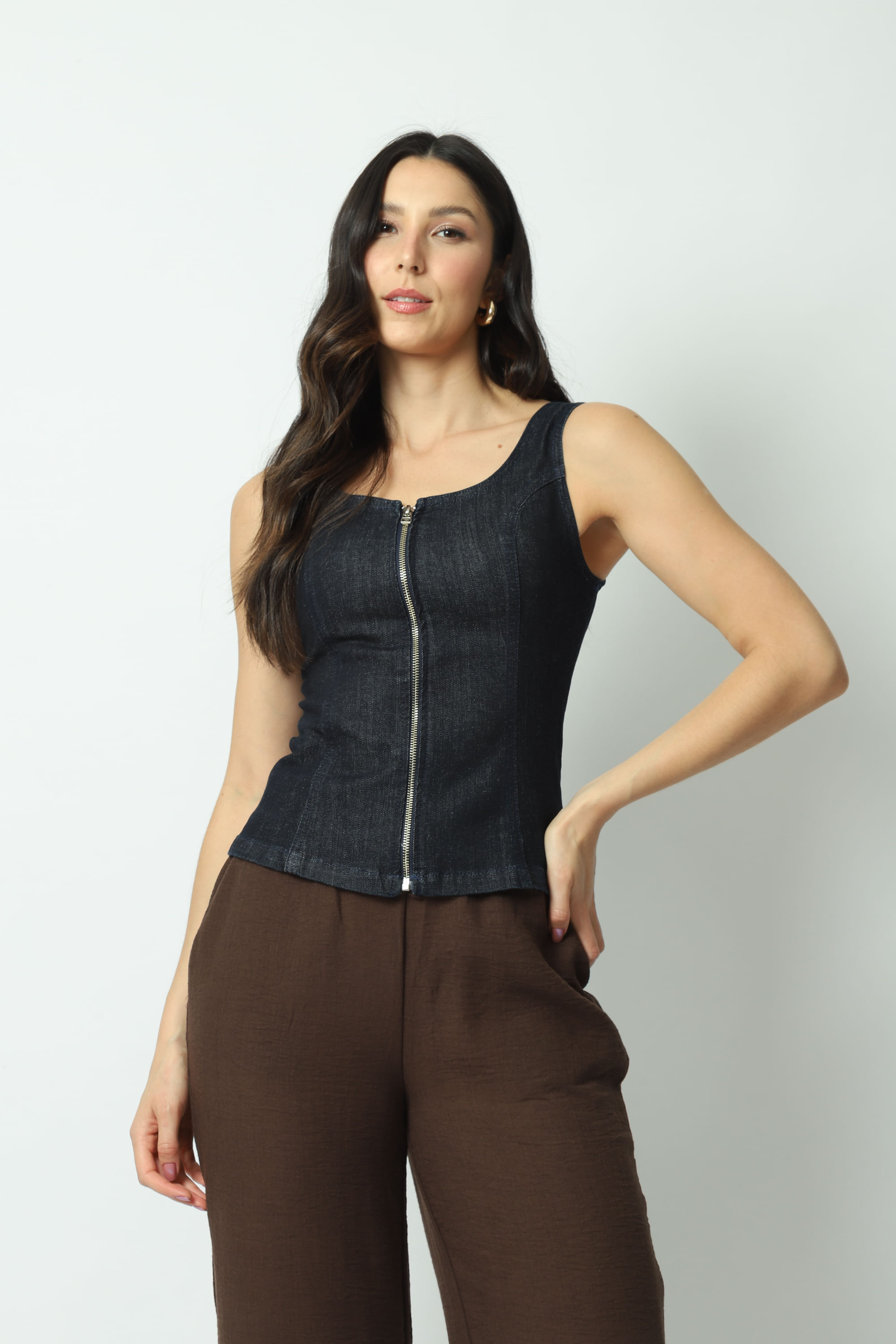 Descrição Colete Jeans , com fechamento frontal por zíper, alças médias, recortes frontais que dá uma acinturada e valoriza o corpo e modelagem justa ao corpo. Confeccionado em um jeans com elasticidade, lavagem azul escuro.