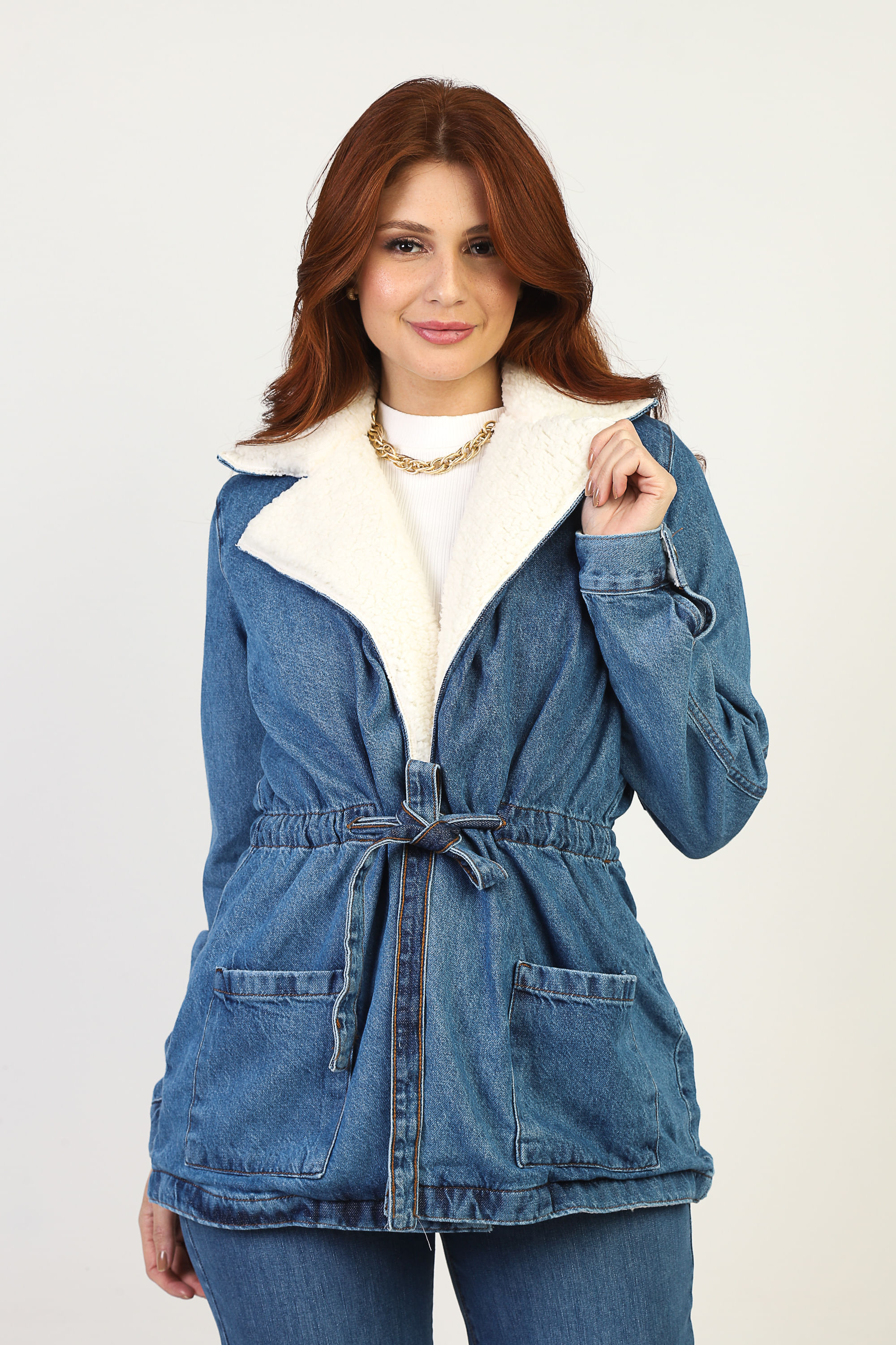 Parka Jeans com forro de pele sintética. Ajuste do próprio tecido na cintura para dar aquela marcada, bolsos quadrados na frete, lavagem azul médio. Ótimo para os dias frios e vc garante um look quentinho e cheio de estilo.