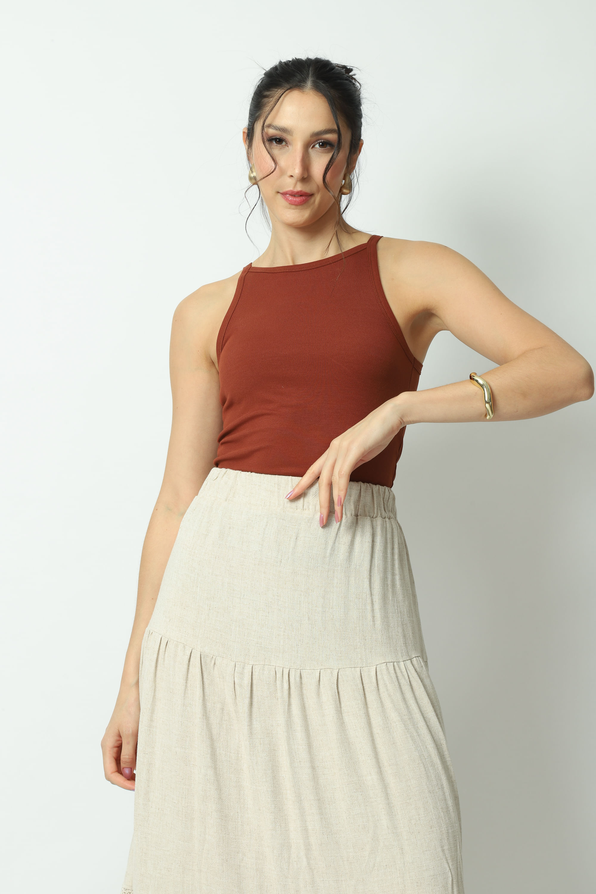 Regata canelada, alças finas, decote da frente reto e mais fechado. Modelagem justa ao corpo e comprimento regular. Confeccionada em malha canelada com mistura de viscose e elastano , toque macio e sedoso e efeito anti pilling que não forma bolinha.