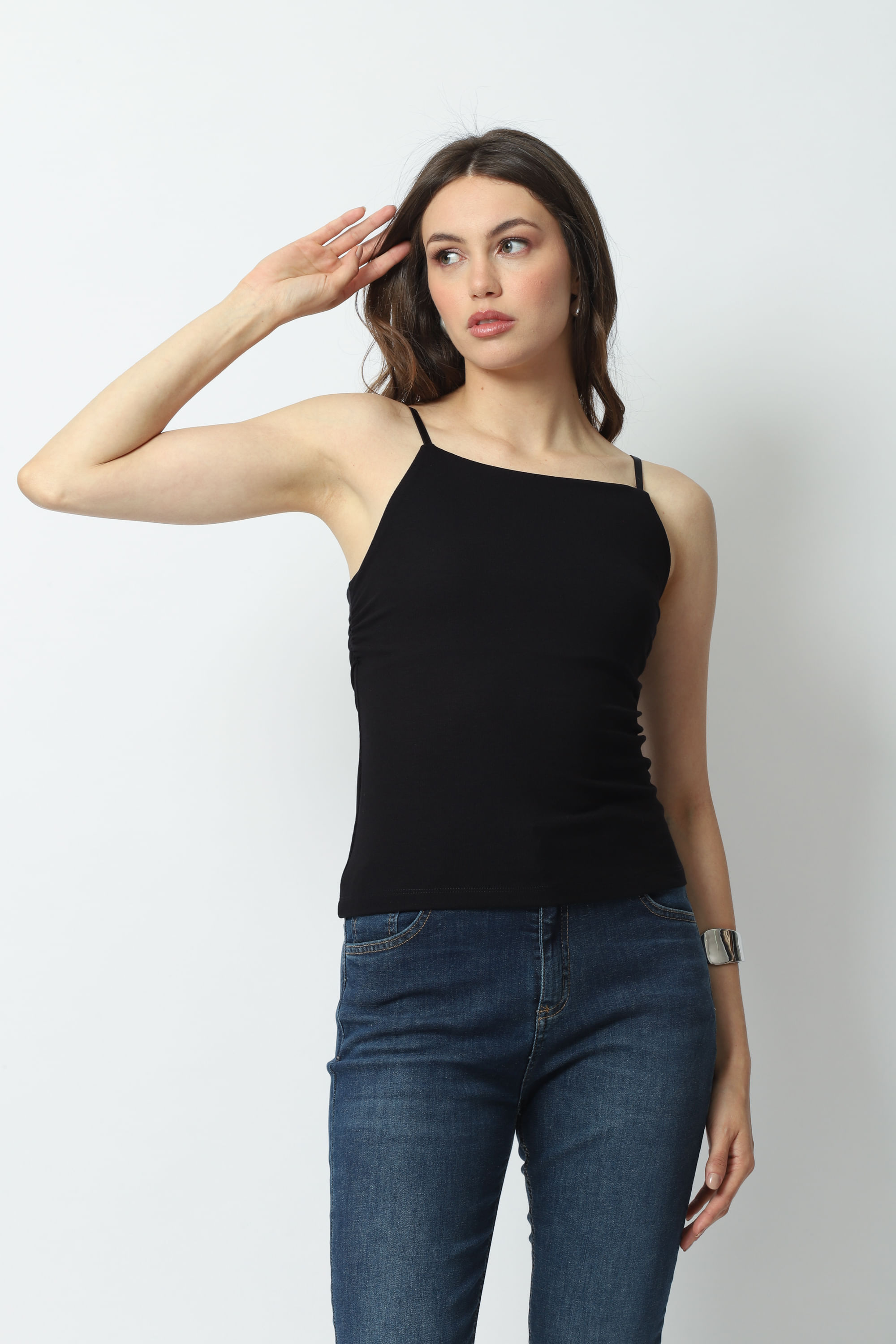 Regata canelada, alças finas,decote reto, modelagem justa ao corpo com detalhe drapeado nas laterais e comprimento alongado. Confeccionada em malha canelada uma mistura de viscose e elastano, toque macio e sedoso e efeito anti pilling que não forma bolinha.