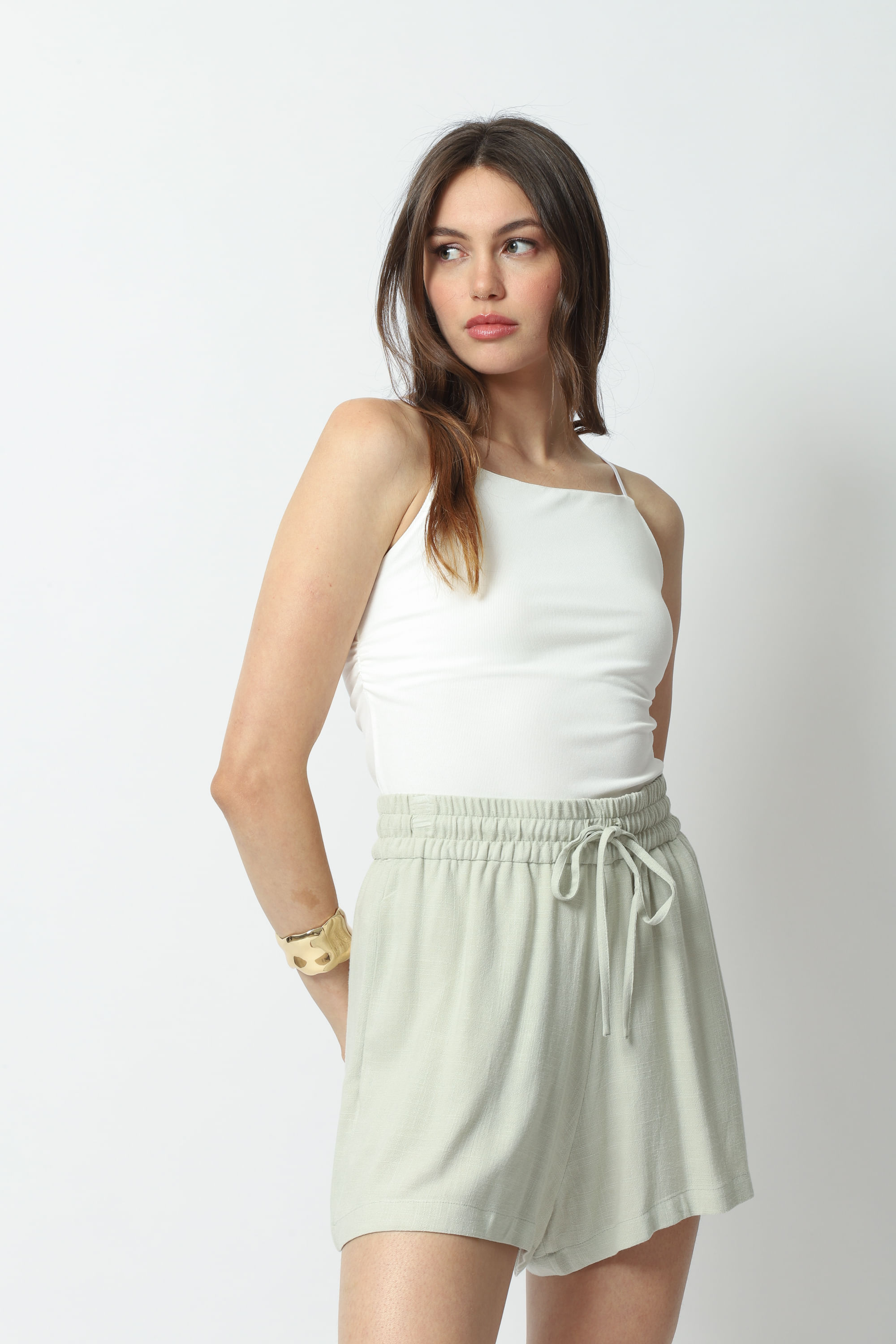 Regata canelada, alças finas,decote reto, modelagem justa ao corpo com detalhe drapeado nas laterais e comprimento alongado. Confeccionada em malha canelada uma mistura de viscose e elastano, toque macio e sedoso e efeito anti pilling que não forma bolinha.
